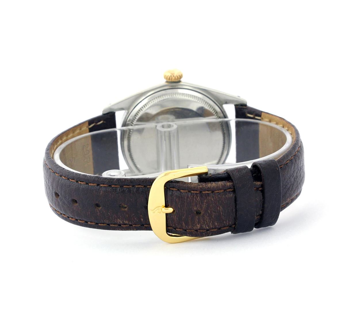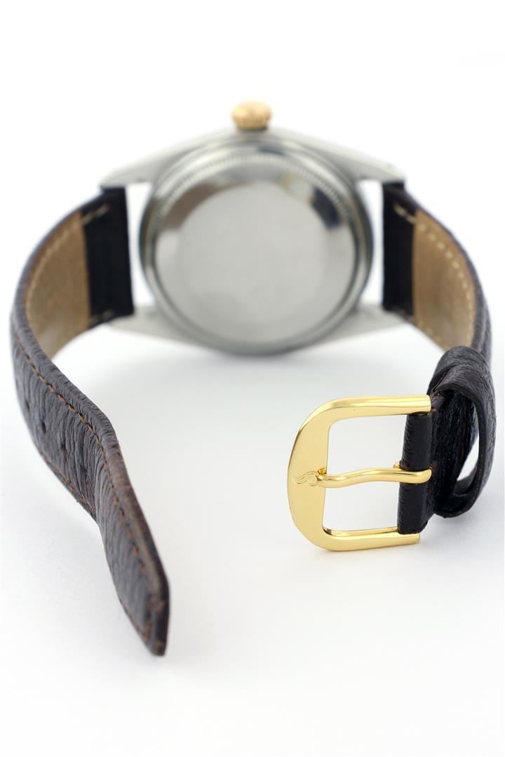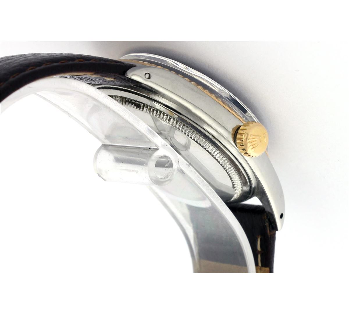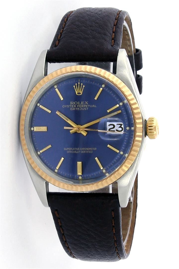 One Gents Rolex Datejust Polished, Serviced & Electronically Tested, Stainless Steel Case:36mm, Rose Gold Crown, Bezel: 18K Rose Gold Fluted Bezel Custom Crystal: Synthetic Sapphire Cyclops Lens. Movement: Automatic Winding Movement Caliber 1570. Dial: Blue Index Dial. Date Window: 3 O'Clock Position Date Display, Nonquick, Model: 1601 Condition: G-6 Extra Fine. Band: Custom Brown Leather Band. 6.5 Inch Length, Adjustable. Custom Clasp.