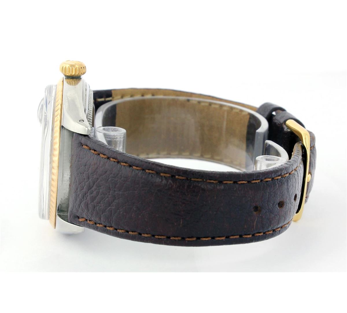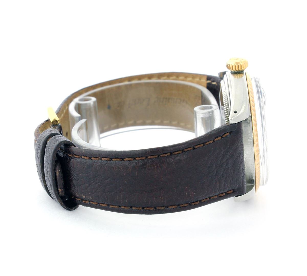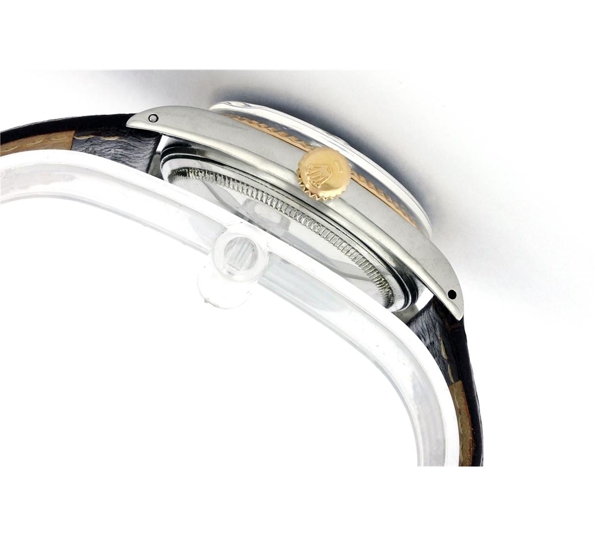 One Gents Rolex Datejust Polished, Serviced & Electronically Tested, Stainless Steel Case:36mm, Rose Gold Crown, Bezel: 18K Rose Gold Fluted Bezel Custom Crystal: Synthetic Sapphire Cyclops Lens. Movement: Automatic Winding Movement Caliber 1570. Dial: Blue Index Dial. Date Window: 3 O'Clock Position Date Display, Nonquick, Model: 1601 Condition: G-6 Extra Fine. Band: Custom Brown Leather Band. 6.5 Inch Length, Adjustable. Custom Clasp.