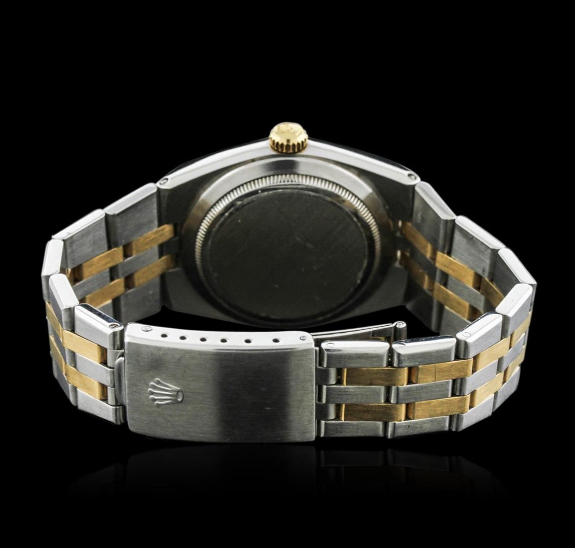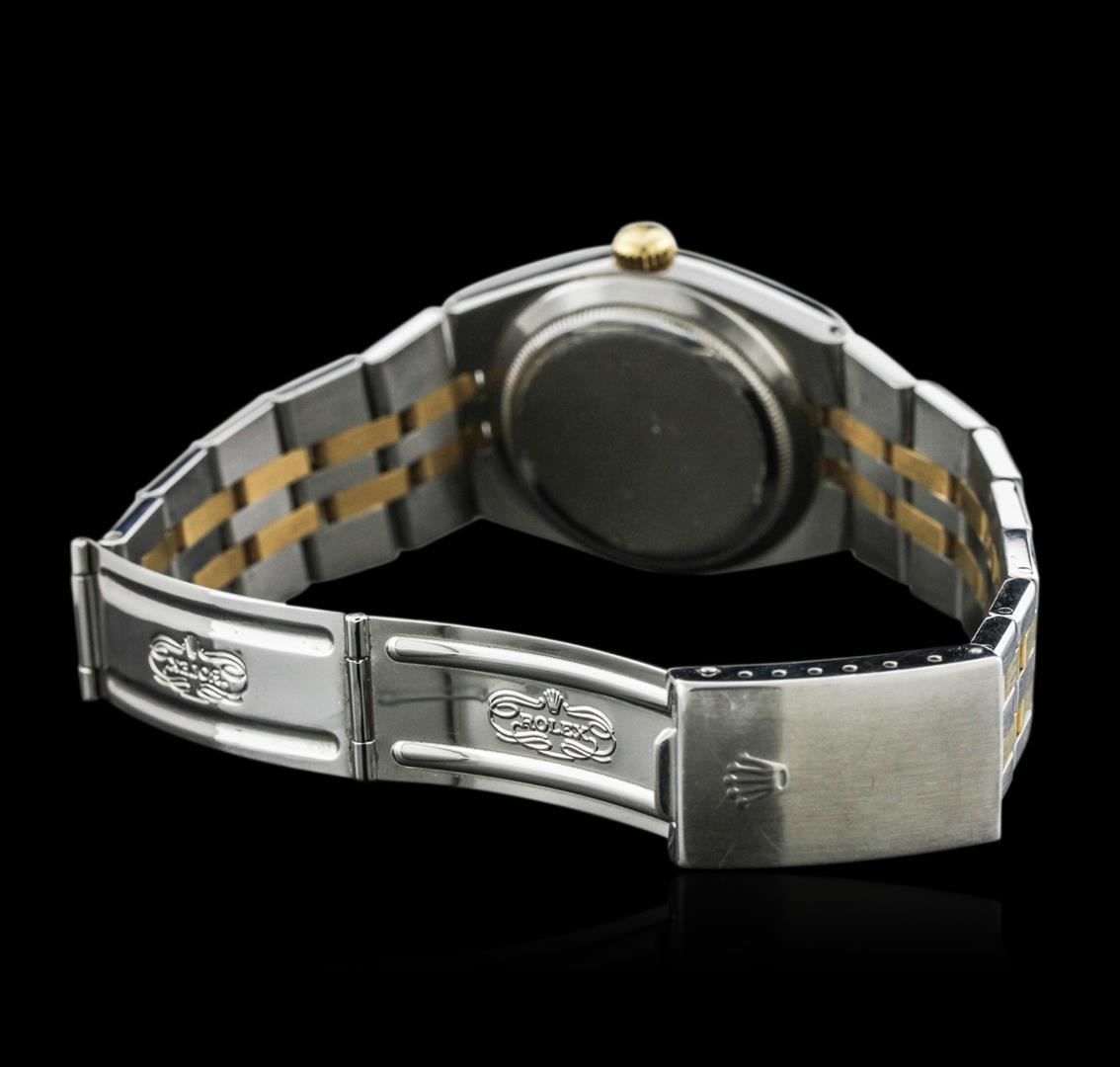 One gents, hand crafted & machine milled Rolex two-tone OysterQuartz DateJust wristwatch electronically tested, Stainless Steel Case: 36mm OysterQuartz, 18KT yellow gold Crown: twinlock with logo, 18KT yellow gold Bezel: fluted, Crystal: synthetic sapphire cyclops lens. Movement: Swiss quartz chronometer, Dial: champagne color, with baton hands and indices, Date Window: 3 o'clock position, quick set, Bracelet: two-tone 18KT yellow gold & stainless steel, OysterQuartz, Condition: G-5 Fine. Bright polish and brushed finish. Seven inch length, adjustable. Circa: 1991.Total Weight of Watch 124.73 grams. AIG Appraised at $6,550.00.