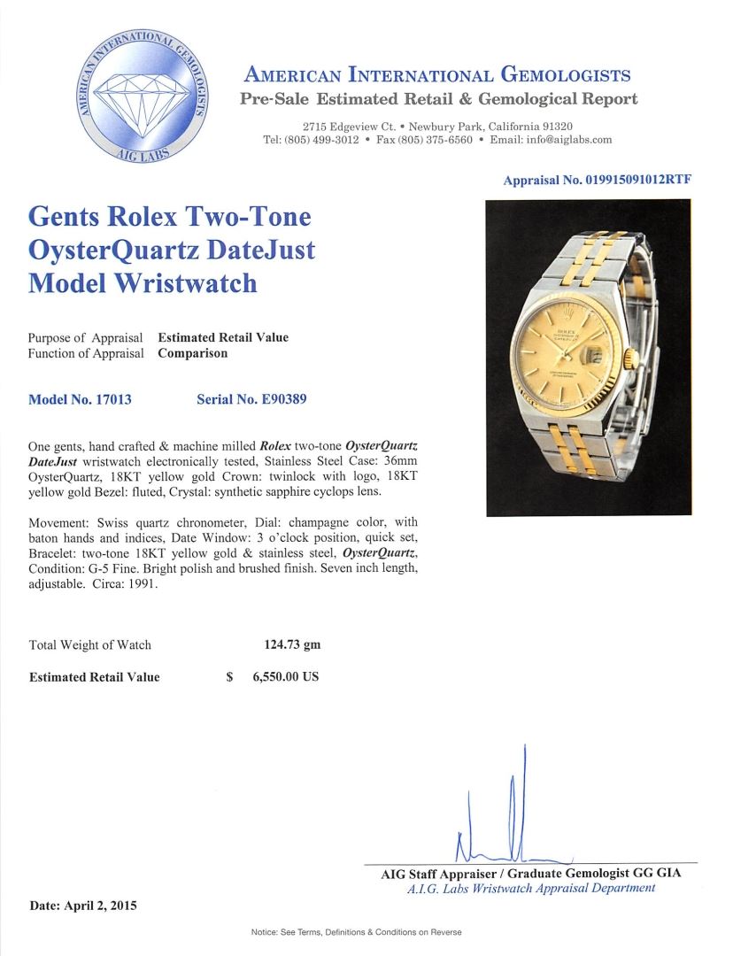 One gents, hand crafted & machine milled Rolex two-tone OysterQuartz DateJust wristwatch electronically tested, Stainless Steel Case: 36mm OysterQuartz, 18KT yellow gold Crown: twinlock with logo, 18KT yellow gold Bezel: fluted, Crystal: synthetic sapphire cyclops lens. Movement: Swiss quartz chronometer, Dial: champagne color, with baton hands and indices, Date Window: 3 o'clock position, quick set, Bracelet: two-tone 18KT yellow gold & stainless steel, OysterQuartz, Condition: G-5 Fine. Bright polish and brushed finish. Seven inch length, adjustable. Circa: 1991.Total Weight of Watch 124.73 grams. AIG Appraised at $6,550.00.