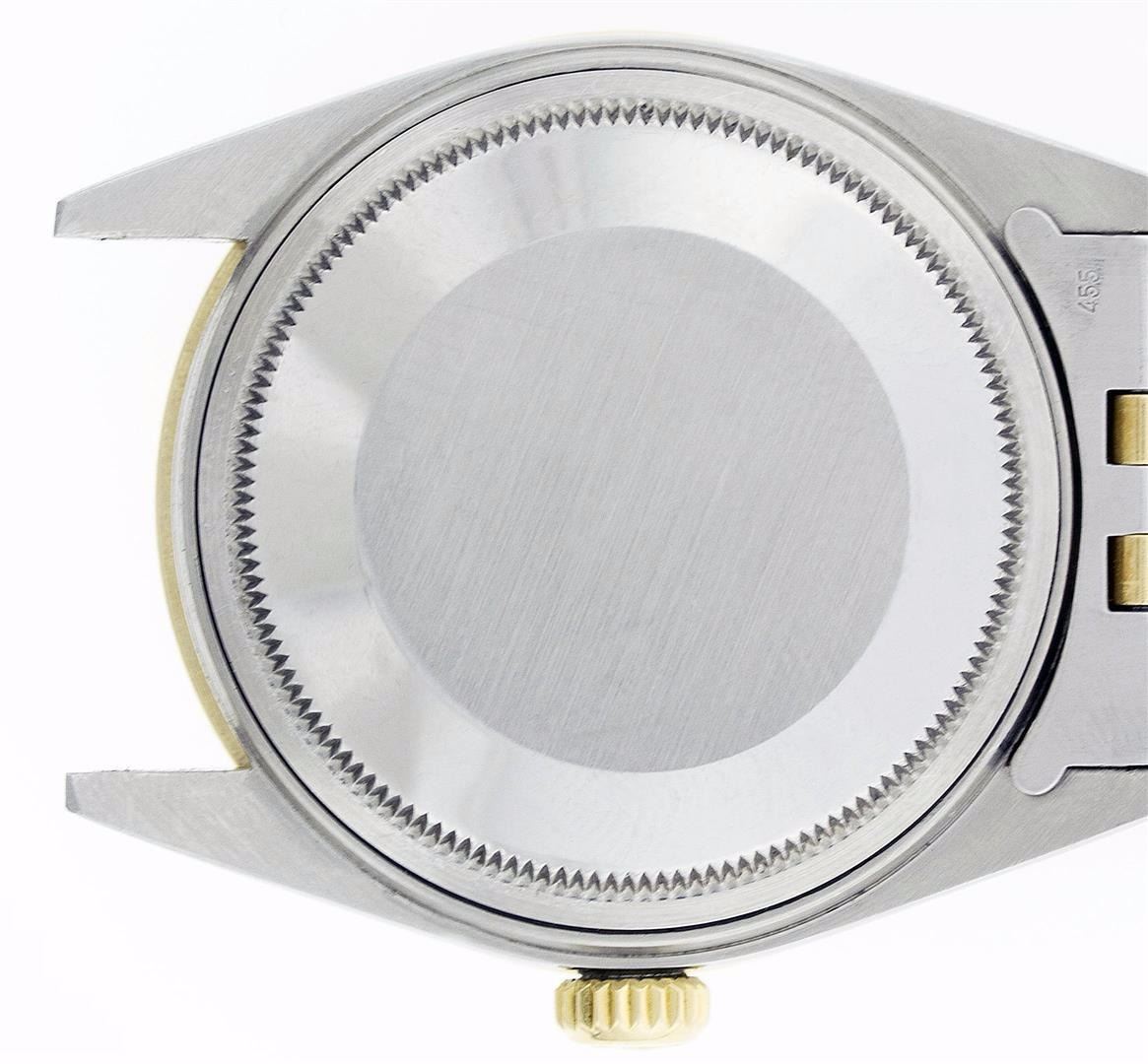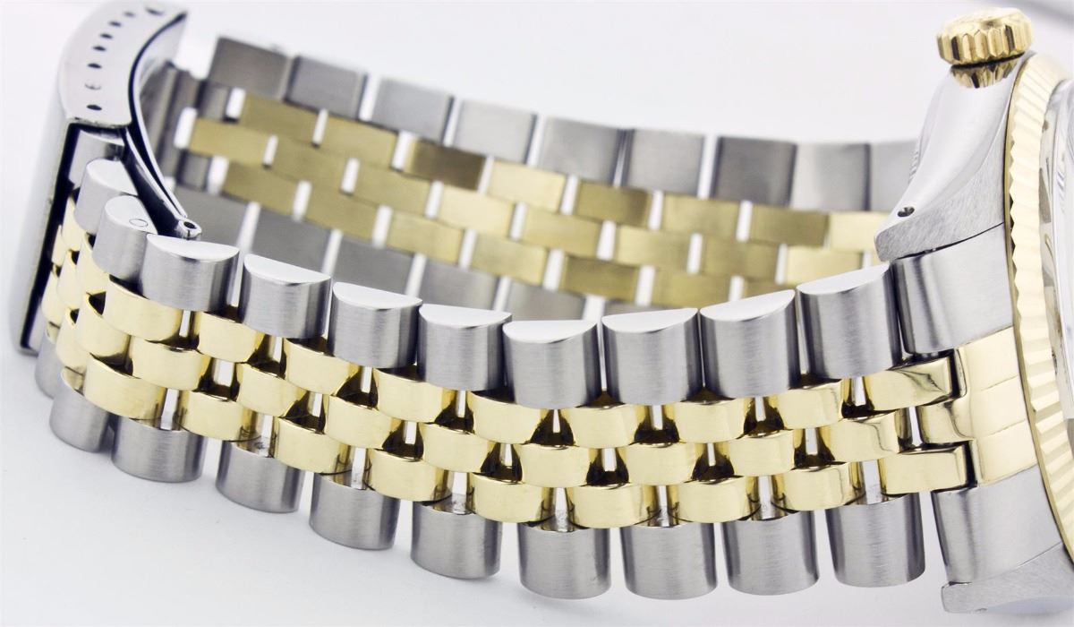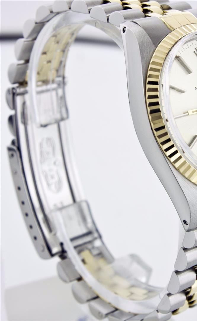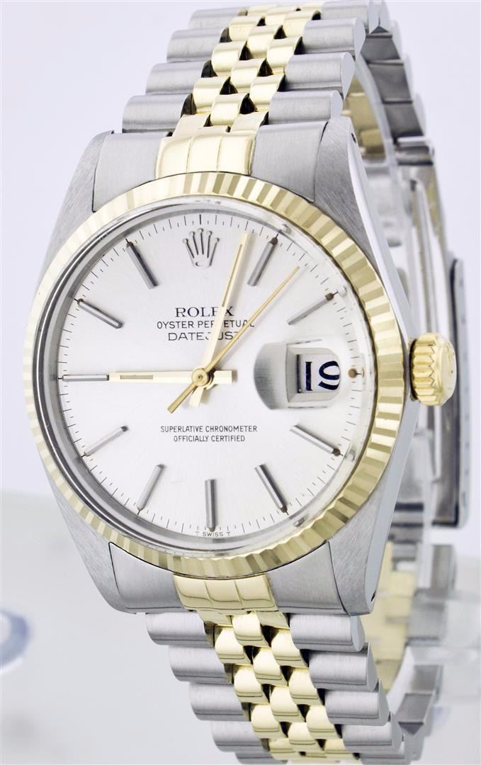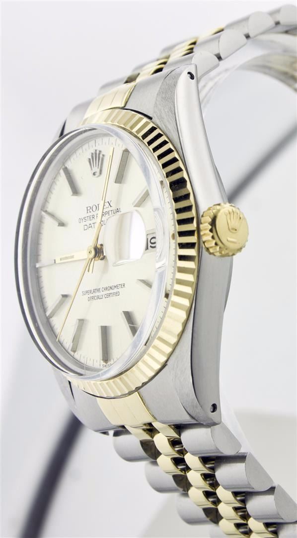 One Mens Two Tone Rolex Datejust Polished, Serviced & Electronically Tested, 14K Yellow Gold & Stainless Steel Case: 36mm,14K Yellow Gold Crown, Bezel: 14K Yellow Gold Fluted Bezel. Custom Crystal: Acrylic Cyclops Lens. Movement: Automatic Winding Movement Caliber 3035. Dial: Silver Dial With Index Hour Markers and Small Track. Date Window: 3 O'Clock Position Date Display, Quickset, Model: 16013 Condition: G-6 Extra Fine. Bracelet:Two Tone 14K Yellow Gold & Stainless Steel Jubilee. Bright Polish. 6.5 Inch Length, Adjustable. Standard Clasp, With Rolex Logo.