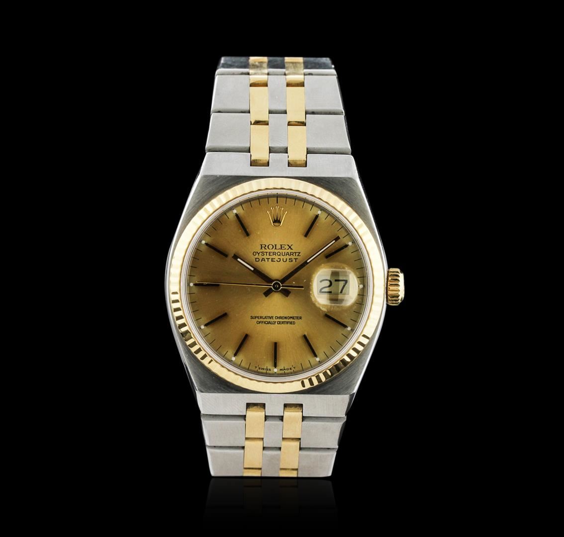 One gents, hand crafted & machine milled Rolex two-tone OysterQuartz DateJust wristwatch electronically tested, Stainless Steel Case: 36mm OysterQuartz, 18KT yellow gold Crown: twinlock with logo, 18KT yellow gold Bezel: fluted, Crystal: synthetic sapphire cyclops lens. Movement: Swiss quartz chronometer, Dial: champagne color, with baton hands and indices, Date Window: 3 o'clock position, quick set, Bracelet: two-tone 18KT yellow gold & stainless steel, OysterQuartz, Condition: G-5 Fine. Bright polish and brushed finish. Seven inch length, adjustable. Circa: 1991.Total Weight of Watch 124.73 grams. AIG Appraised at $6,550.00.