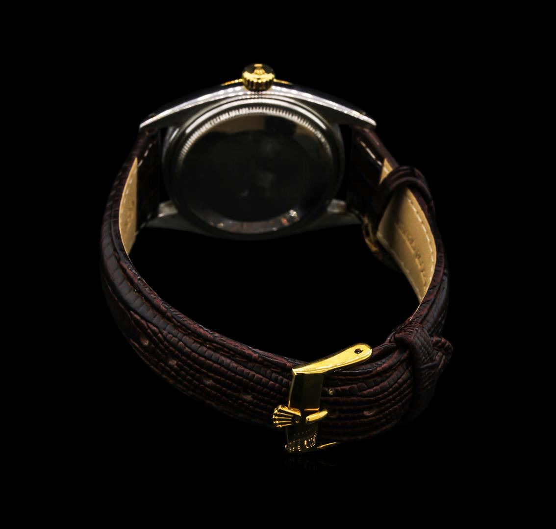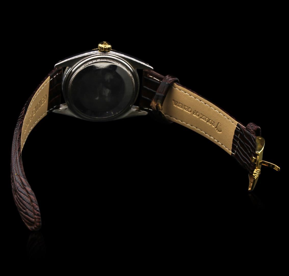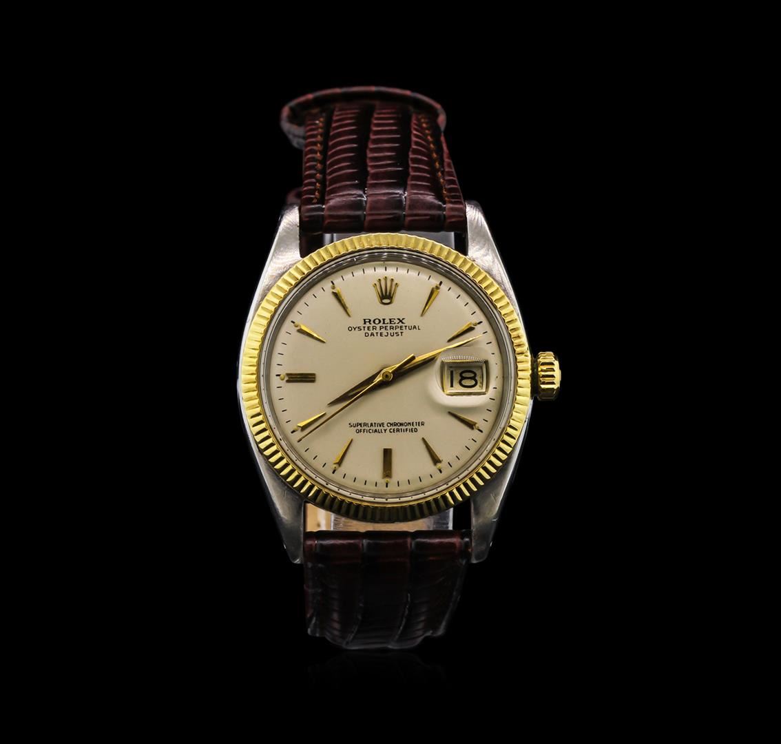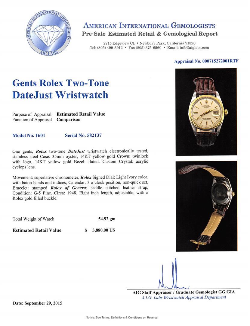 One gents, Rolex two-tone DateJust wristwatch electronically tested, stainless steel Case: 35mm oyster, 14KT yellow gold Crown: twinlock with logo, 14KT yellow gold Bezel: fluted. Custom Crystal: acrylic cyclops lens. Movement: superlative chronometer, Rolex Signed Dial: Light Ivory color, with baton hands and indices, Calendar: 3 o'clock position, non-quick set, Bracelet: stamped Rolex of Geneva; saddle stitched leather strap, Condition: G-5 Fine. Circa: 1948, Eight inch length, adjustable, with a Rolex gold filled buckle. Total Weight of Watch 54.92gm. AIG Appraised at $3,880.00.