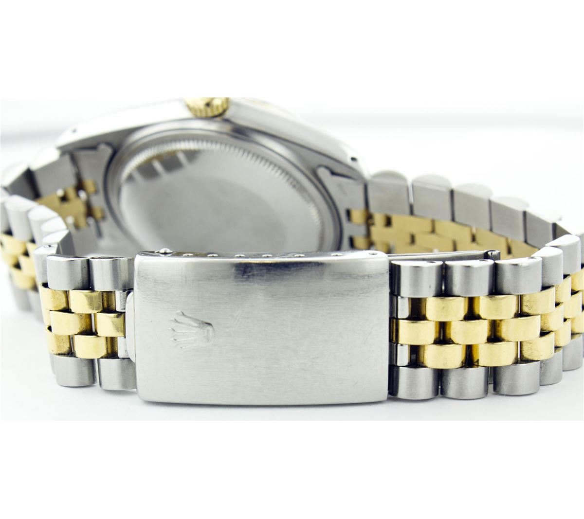 One Gents Two Tone Rolex Datejust Polished, Serviced & Electronically Tested, 14K Yellow Gold & Stainless Steel Case:36mm, 14K Yellow Gold Crown, Custom Bezel: 18K Yellow Gold Fluted Bezel. Custom Crystal: Acrylic Cyclops Lens. Movement: Automatic Winding Movement Caliber 3035. Custom Dial: Champagne Tapestry With Index Hour Markers. Date Window: 3 O'Clock Position Date Display, Quickset, Model: 16013 Condition: G-6 Extra Fine. Bracelet: Two Tone 14K Yellow Gold & Stainless Steel Jubilee. Bright Polish. 6.5 Inch Length, Adjustable. Standard Clasp, With Rolex Logo.