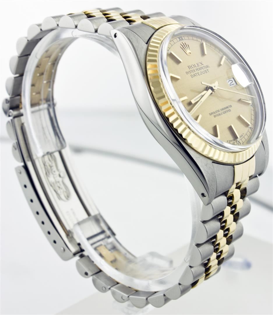 One Gents Two Tone Rolex Datejust Polished, Serviced & Electronically Tested, 14K Yellow Gold & Stainless Steel Case:36mm, 14K Yellow Gold Crown, Bezel: 14K Yellow Gold Fluted Bezel. Custom Crystal: Acrylic Cyclops Lens. Movement: Automatic Winding Movement Caliber 3035. Custom Dial: Champagne With Index Hour Markers. Date Window: 3 O'Clock Position Date Display, Quickset, Model: 16013 Condition: G-6 Extra Fine. Bracelet: Two Tone 14K Yellow Gold & Stainless Steel Jubilee. Bright Polish. 6.5 Inch Length, Adjustable. Standard Clasp, With Rolex Logo.