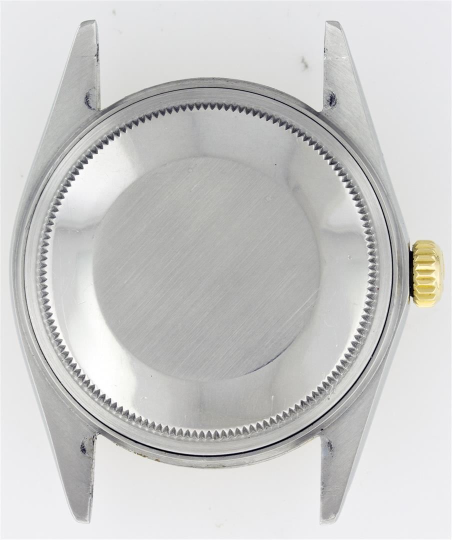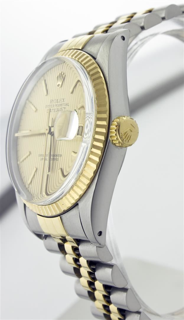 One Gents Two Tone Rolex Datejust Polished, Serviced & Electronically Tested, 14K Yellow Gold & Stainless Steel Case:36mm, 14K Yellow Gold Crown, Custom Bezel: 18K Yellow Gold Fluted Bezel. Custom Crystal: Acrylic Cyclops Lens. Movement: Automatic Winding Movement Caliber 3035. Custom Dial: Champagne Tapestry With Index Hour Markers. Date Window: 3 O'Clock Position Date Display, Quickset, Model: 16013 Condition: G-6 Extra Fine. Bracelet: Two Tone 14K Yellow Gold & Stainless Steel Jubilee. Bright Polish. 6.5 Inch Length, Adjustable. Standard Clasp, With Rolex Logo.