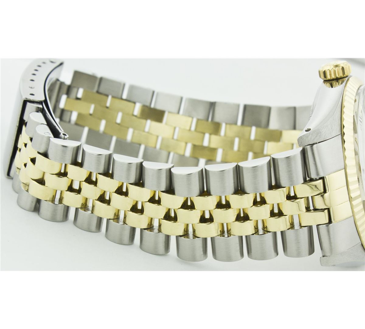 One Gents Two Tone Rolex Datejust Polished, Serviced & Electronically Tested, 14K Yellow Gold & Stainless Steel Case:36mm, 14K Yellow Gold Crown, Custom Bezel: 18K Yellow Gold Fluted Bezel. Custom Crystal: Acrylic Cyclops Lens. Movement: Automatic Winding Movement Caliber 3035. Custom Dial: Silver Dial With Index Hour Markers. Date Window: 3 O'Clock Position Date Display, Quickset, Model: 16013 Condition: G-6 Extra Fine. Bracelet: Two Tone 14K Yellow Gold & Stainless Steel Jubilee. Bright Polish. 6.5 Inch Length, Adjustable. Standard Clasp, With Rolex Logo.
