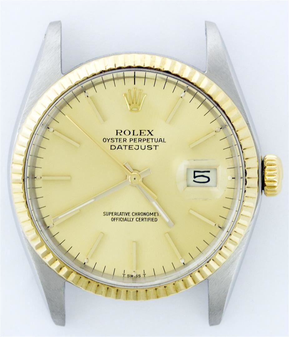 One Mens Two Tone Rolex Datejust Polished, Serviced & Electronically Tested, 14K Yellow Gold & Stainless Steel Case: 36mm,14K Yellow Gold Crown, Bezel: 14K Yellow Gold Fluted Bezel. Custom Crystal: Acrylic Cyclops Lens. Movement: Automatic Winding Movement Caliber 3035. Custom Dial: Champagne Dial With Index Hour Markers and Small Track. Color: G Date Window: 3 O'Clock Position Date Display, Quickset, Model: 16013 Condition: G-6 Extra Fine. Bracelet: Two Tone 14K Yellow Gold & Stainless Steel Jubilee. Bright Polish. 6.5 Inch Length, Adjustable. Standard Clasp, With Rolex Logo.