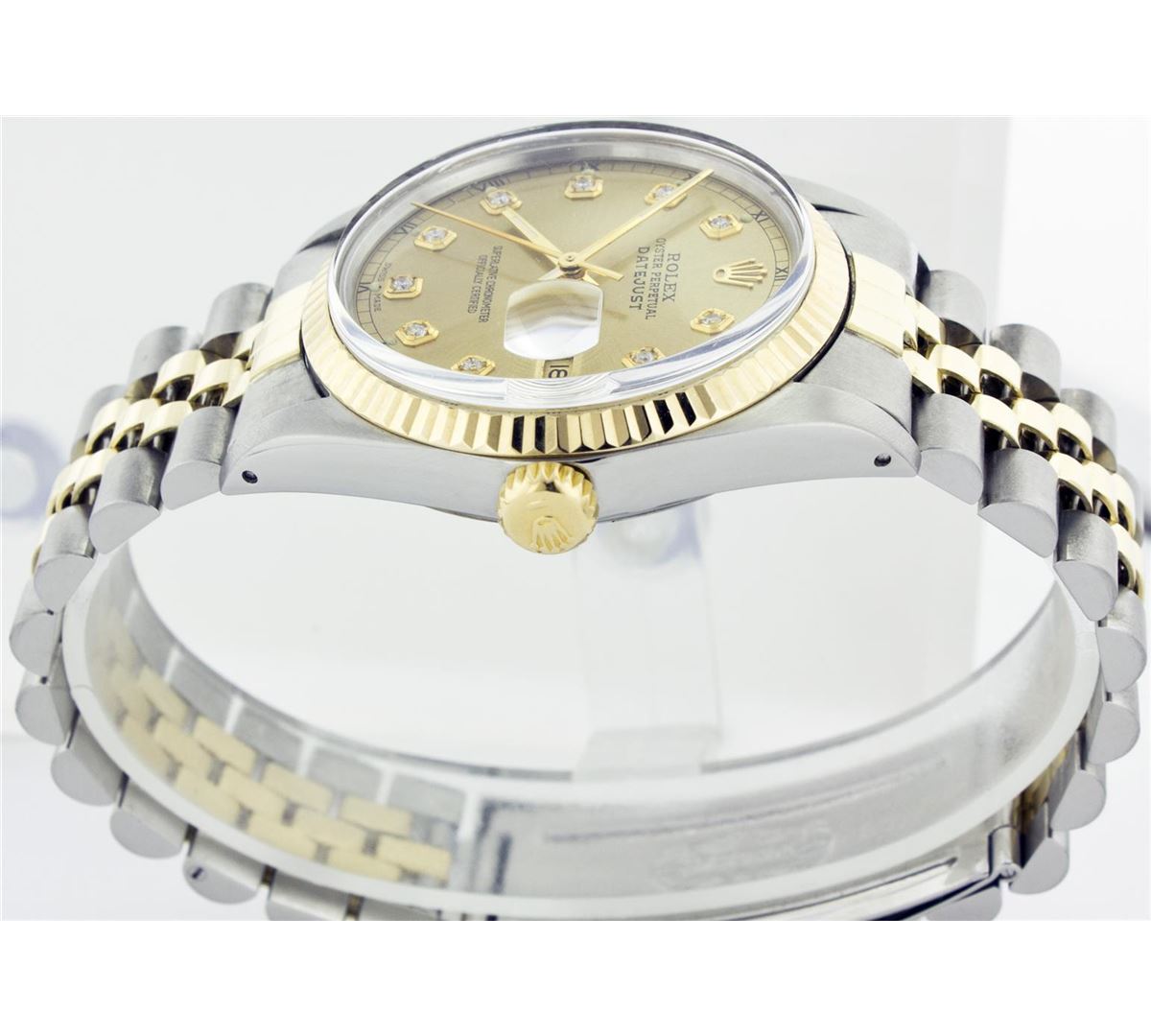 One Mens Two Tone Rolex Datejust Polished, Serviced & Electronically Tested, 14K Yellow Gold & Stainless Steel Case: 36mm,14K Yellow Gold Crown, Bezel: 14K Yellow Gold Fluted Bezel. Custom Crystal: Acrylic Cyclops Lens. Movement: Automatic Winding Movement Caliber 3035. Custom Dial: Champagne Diamond Dial With Track and Luminecent Markers. Diamond Count: 10 Diamonds In Dial, Color: G To H, Clarity: VS2-SI1. Date Window: 3 O'Clock Position Date Display, Quickset, Model: 16013 Condition: G-6 Extra Fine. Bracelet:Two Tone 14K Yellow Gold & Stainless Steel Jubilee. Bright Polish. 6.5 Inch Length, Adjustable. Standard Clasp, With Rolex Logo.