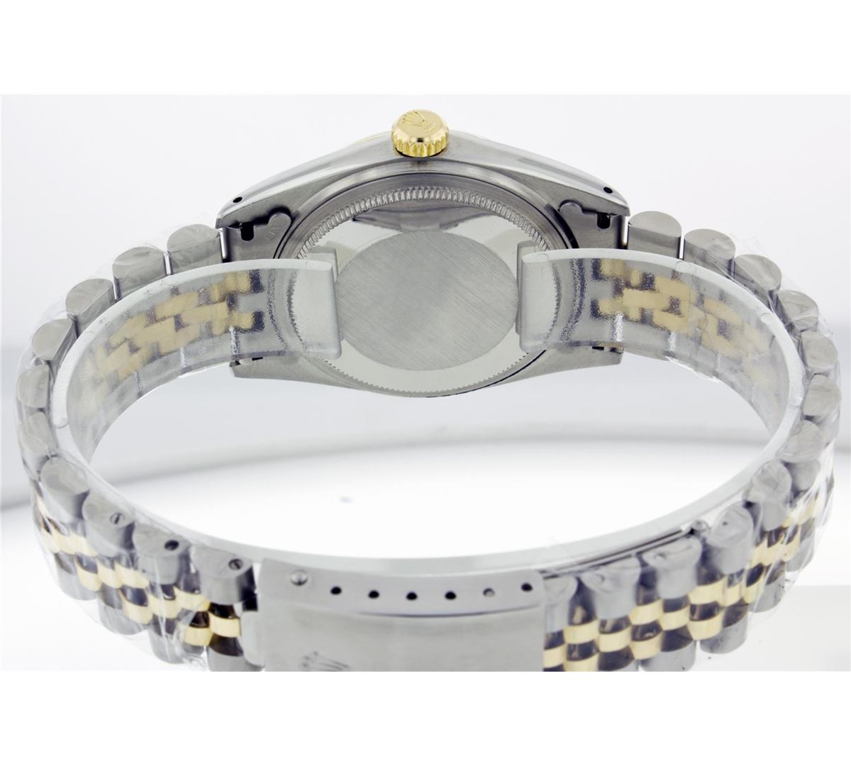 One Gents Two Tone Rolex Datejust Polished, Serviced & Electronically Tested, 14K Yellow Gold & Stainless Steel Case:36mm, 14K Yellow Gold Crown, Custom Bezel: 18K Yellow Gold Fluted Bezel. Custom Crystal: Acrylic Cyclops Lens. Movement: Automatic Winding Movement Caliber 3035. Custom Dial: Mother Of Pearl With Roman Hour Markers Date Window: 3 O'Clock Position Date Display, Quickset, Model: 16013 Condition: G-6 Extra Fine. Bracelet: Two Tone 14K Yellow Gold & Stainless Steel Jubilee. Bright Polish. 6.5 Inch Length, Adjustable. Standard Clasp, With Rolex Logo.