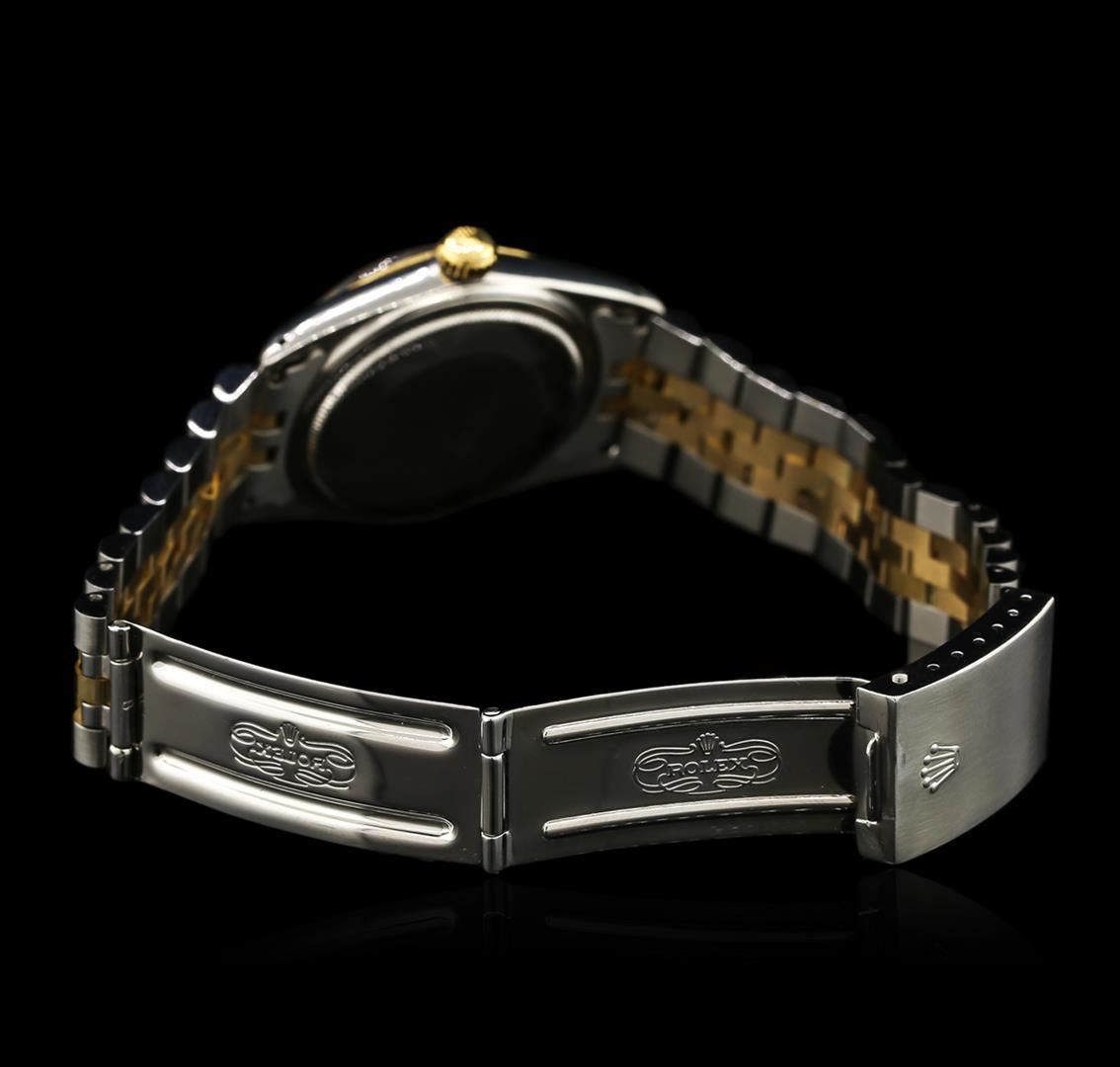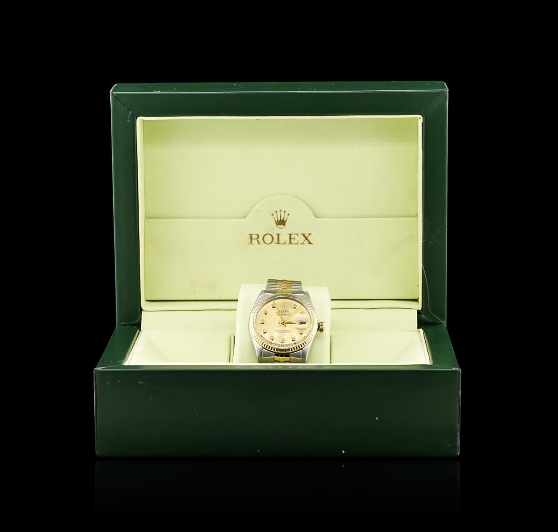 One gents, hand crafted & machine milled Rolex two-tone DateJust wristwatch electronically tested, Stainless Steel Case: 36mm oyster, 14KT yellow gold Crown: twinlock with logo, 14KT yellow gold Bezel: fluted, Custom Crystal: acrylic cyclops lens, Circa: 1980. Movement: superlative chronometer, Custom Dial: Champagne color, with baton hands, diamond markers, and a bordering minute track with bolded five minute intervals. Date Window: 3 o'clock position, quick set, Bracelet: two-tone 14KT yellow gold & stainless steel jubilee, Bright polish & brushed finish, Condition: G-6 Extra Fine. Seven and three quarter inch length, adjustable. Standard clasp, with logo. Total Weight of Watch: 90.68 grams. Includes Rolex box. AIG Appraised at $8,050.00.