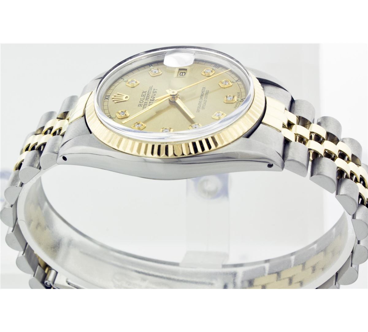 One Mens Two Tone Rolex Datejust Polished, Serviced & Electronically Tested, 14K Yellow Gold & Stainless Steel Case: 36mm,14K Yellow Gold Crown, Bezel: 14K Yellow Gold Fluted Bezel. Custom Crystal: Acrylic Cyclops Lens. Movement: Automatic Winding Movement Caliber 3035. Custom Dial: Champagne Diamond Dial With Track and Luminescent Markers. Diamond Count: 10 Diamonds In Dial, Color: G To H, Clarity: VS2-SI1. Date Window: 3 O'Clock Position Date Display, Quickset, Model: 16013 Condition: G-6 Extra Fine. Bracelet: Two Tone 14K Yellow Gold & Stainless Steel Jubilee. Bright Polish. 6.5 Inch Length, Adjustable. Standard Clasp, With Rolex Logo.