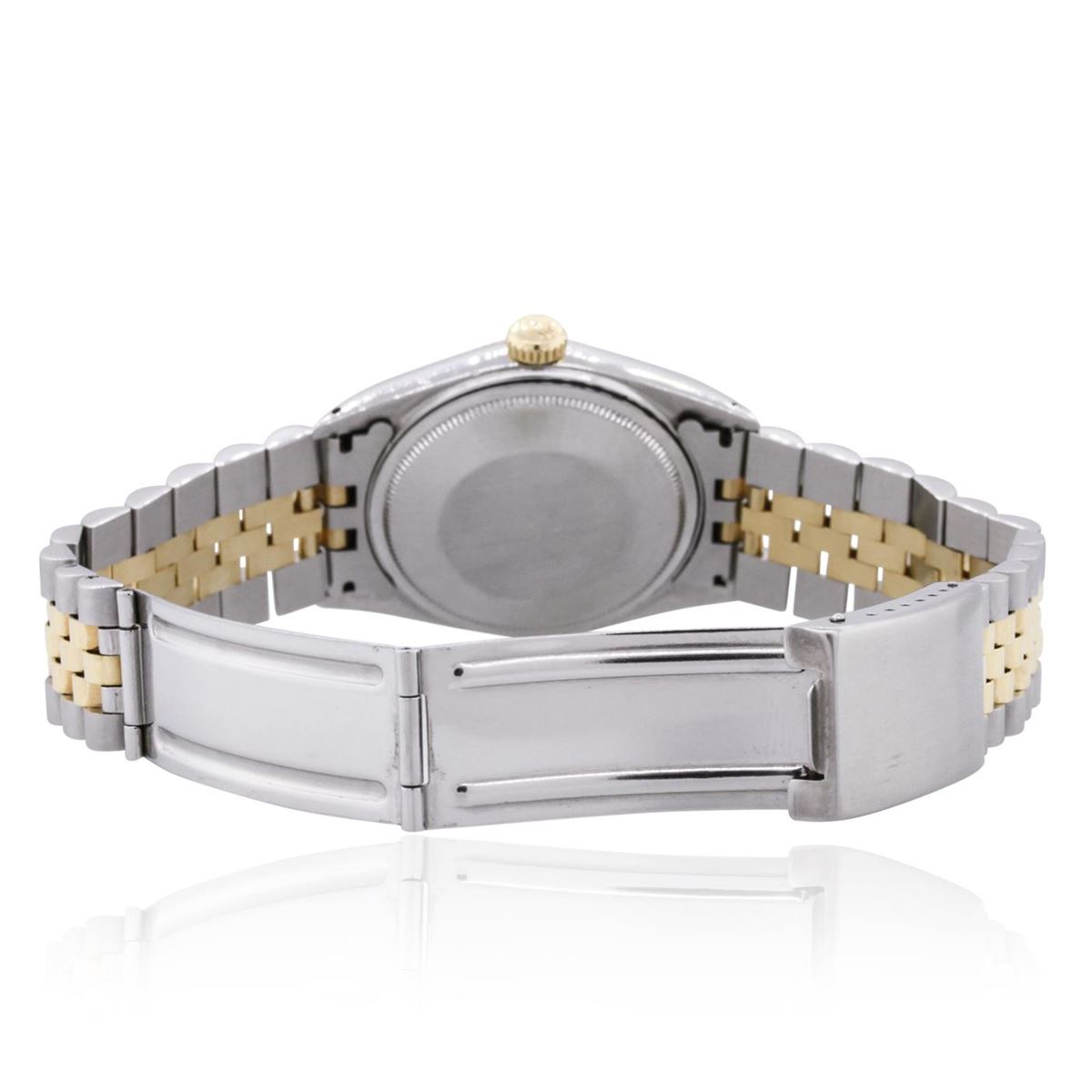 One gents, hand crafted & machine milled Rolex two-tone DateJust model wristwatch electronically tested, Stainless Steel Case: 36mm oyster, Custom Crystal: acrylic cyclops lens, 14KT yellow gold Crown: twinlock with logo, Bezel: 14KT yellow gold fluted, Movement: superlative chronometer. Dial: Silvered Hounds-tooth, with baton hands & indices, Circa: 1969, Date Window: 3 o'clock position non-quick set, Italian Custom Bracelet: two-tone stainless steel & 14KT yellow gold jubilee style, Condition: G-4 Average. Seven and one quarter inch length, adjustable. Standard clasp, with logo. Total Weight of Watch 89.30 grams. AIG Appraised at $6,550.00.