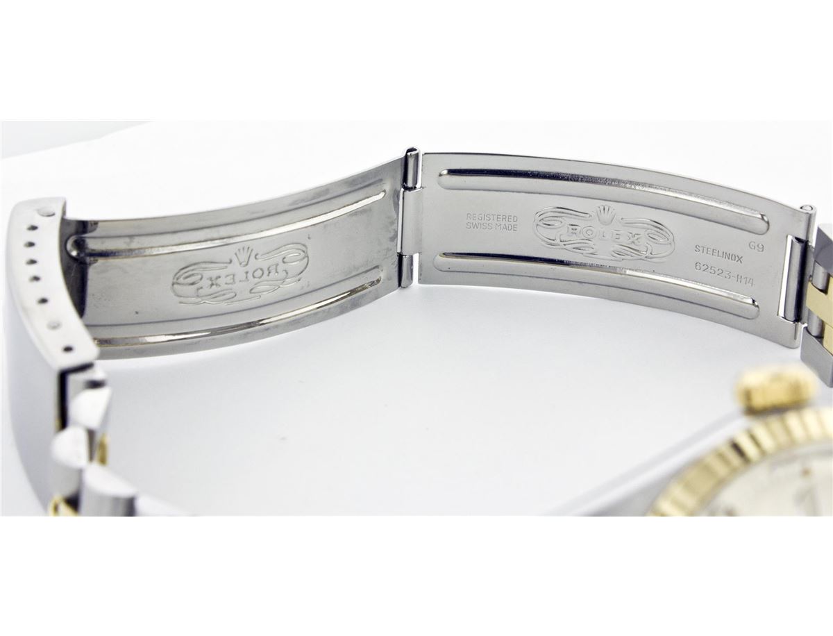 One Gents Two Tone Rolex Datejust Polished, Serviced & Electronically Tested, 14K Yellow Gold & Stainless Steel Case:36mm, 14K Yellow Gold Crown, Custom Bezel: 18K Yellow Gold Fluted Bezel. Custom Crystal: Acrylic Cyclops Lens. Movement: Automatic Winding Movement Caliber 3035. Custom Dial: Silver Dial With Index Hour Markers. Date Window: 3 O'Clock Position Date Display, Quickset, Model: 16013 Condition: G-6 Extra Fine. Bracelet: Two Tone 14K Yellow Gold & Stainless Steel Jubilee. Bright Polish. 6.5 Inch Length, Adjustable. Standard Clasp, With Rolex Logo.
