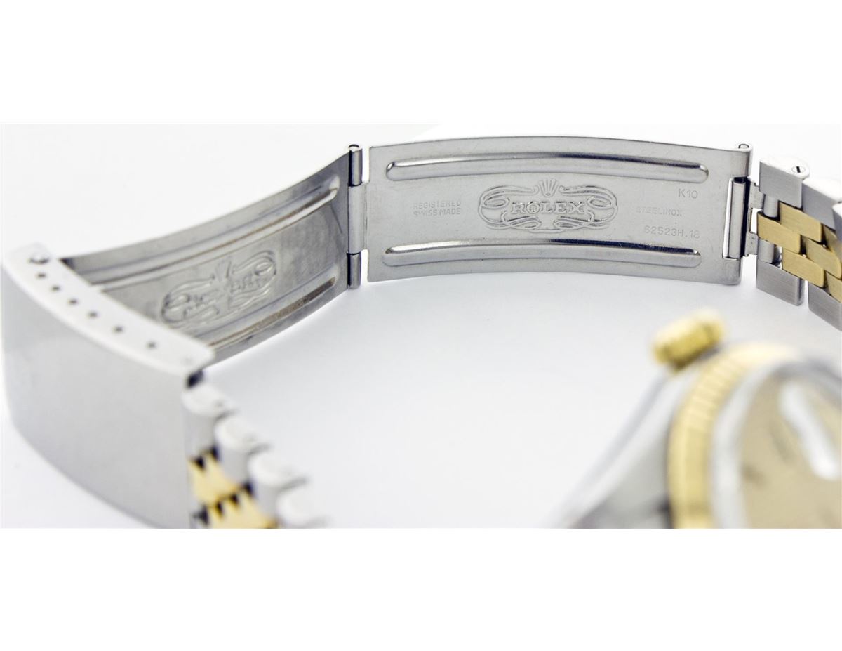 One Gents Two Tone Rolex Datejust Polished, Serviced & Electronically Tested, 14K Yellow Gold & Stainless Steel Case: 36mm,14K Yellow Gold Crown, Bezel: 14K Yellow Gold Fluted Bezel. Custom Crystal: Acrylic Cyclops Lens. Movement: Automatic Winding Movement Caliber 3035. Dial: Champagne Tapestry Dial With Index Hour Markers. Date Window: 3 O'Clock Position Date Display, Quickset, Model: 16013 Condition: G-6 Extra Fine. Bracelet: Two Tone 14K Yellow Gold & Stainless Steel Jubilee. Bright Polish. 6.5 Inch Length, Adjustable. Standard Clasp, With Rolex Logo.