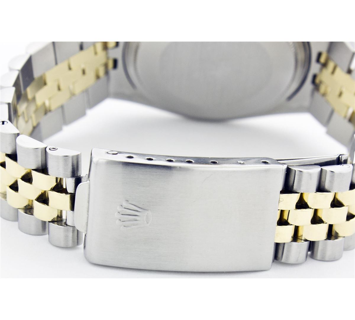 One Gents Two Tone Rolex Datejust Polished, Serviced & Electronically Tested, 14K Yellow Gold & Stainless Steel Case:36mm, 14K Yellow Gold Crown, Custom Bezel: 18K Yellow Gold Fluted Bezel. Custom Crystal: Acrylic Cyclops Lens. Movement: Automatic Winding Movement Caliber 3035. Custom Dial: Silver Dial With Index Hour Markers. Date Window: 3 O'Clock Position Date Display, Quickset, Model: 16013 Condition: G-6 Extra Fine. Bracelet: Two Tone 14K Yellow Gold & Stainless Steel Jubilee. Bright Polish. 6.5 Inch Length, Adjustable. Standard Clasp, With Rolex Logo.