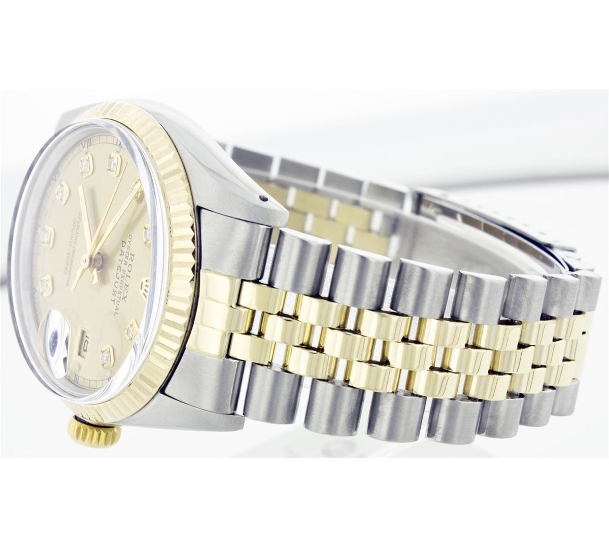 One Mens Two Tone Rolex Datejust Polished, Serviced & Electronically Tested, 14K Yellow Gold & Stainless Steel Case: 36mm,14K Yellow Gold Crown, Bezel: 14K Yellow Gold Fluted Bezel. Custom Crystal: Acrylic Cyclops Lens. Movement: Automatic Winding Movement Caliber 3035. Custom Dial: Champagne Diamond Dial With Track and Luminescent Markers. Diamond Count: 10 Diamonds In Dial, Color: G To H, Clarity: VS2-SI1. Date Window: 3 O'Clock Position Date Display, Quickset, Model: 16013 Condition: G-6 Extra Fine. Bracelet: Two Tone 14K Yellow Gold & Stainless Steel Jubilee. Bright Polish. 6.5 Inch Length, Adjustable. Standard Clasp, With Rolex Logo.