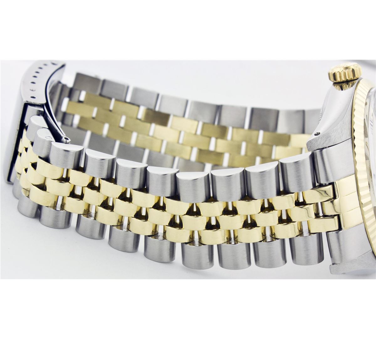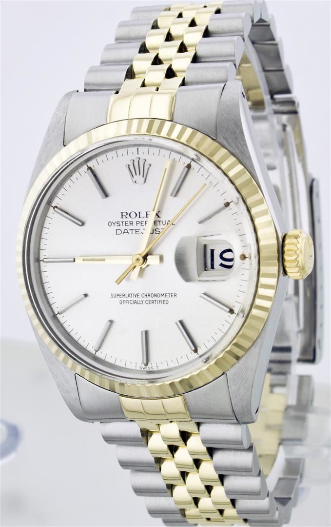 One Mens Two Tone Rolex Datejust Polished, Serviced & Electronically Tested, 14K Yellow Gold & Stainless Steel Case: 36mm,14K Yellow Gold Crown, Bezel: 14K Yellow Gold Fluted Bezel. Custom Crystal: Acrylic Cyclops Lens. Movement: Automatic Winding Movement Caliber 3035. Dial: Silver Dial With Index Hour Markers and Small Track. Date Window: 3 O'Clock Position Date Display, Quickset, Model: 16013 Condition: G-6 Extra Fine. Bracelet: Two Tone 14K Yellow Gold & Stainless Steel Jubilee. Bright Polish. 6.5 Inch Length, Adjustable. Standard Clasp, With Rolex Logo.