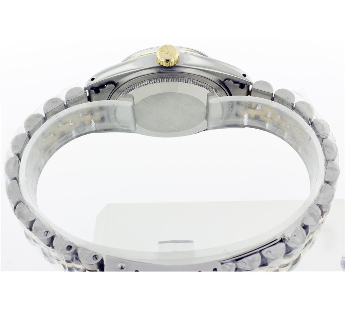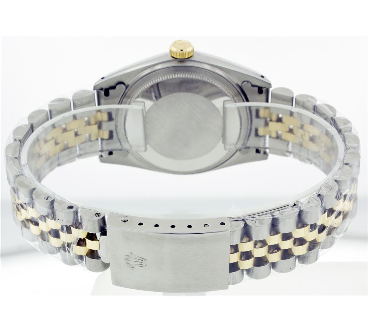 One Gents Two Tone Rolex Datejust Polished, Serviced & Electronically Tested, 14K Yellow Gold & Stainless Steel Case:36mm, 14K Yellow Gold Crown, Custom Bezel: 18K Yellow Gold Fluted Bezel. Custom Crystal: Acrylic Cyclops Lens. Movement: Automatic Winding Movement Caliber 3035. Custom Dial: Mother Of Pearl With Roman Hour Markers Date Window: 3 O'Clock Position Date Display, Quickset, Model: 16013 Condition: G-6 Extra Fine. Bracelet: Two Tone 14K Yellow Gold & Stainless Steel Jubilee. Bright Polish. 6.5 Inch Length, Adjustable. Standard Clasp, With Rolex Logo.