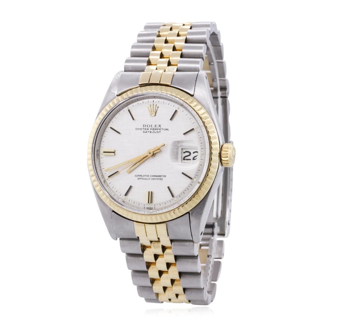 One gents, hand crafted & machine milled Rolex two-tone DateJust model wristwatch electronically tested, Stainless Steel Case: 36mm oyster, Custom Crystal: acrylic cyclops lens, 14KT yellow gold Crown: twinlock with logo, Bezel: 14KT yellow gold fluted, Movement: superlative chronometer. Dial: Silvered Hounds-tooth, with baton hands & indices, Circa: 1969, Date Window: 3 o'clock position non-quick set, Italian Custom Bracelet: two-tone stainless steel & 14KT yellow gold jubilee style, Condition: G-4 Average. Seven and one quarter inch length, adjustable. Standard clasp, with logo. Total Weight of Watch 89.30 grams. AIG Appraised at $6,550.00.