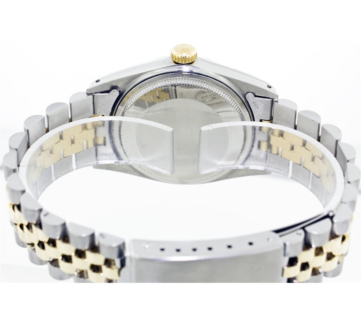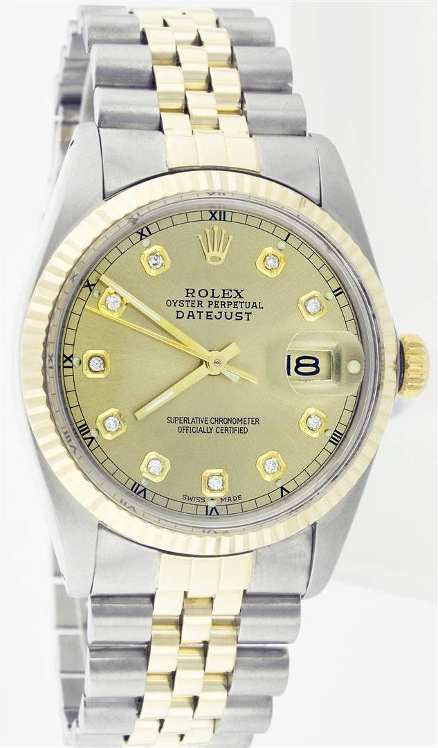 One Mens Two Tone Rolex Datejust Polished, Serviced & Electronically Tested, 14K Yellow Gold & Stainless Steel Case: 36mm,14K Yellow Gold Crown, Bezel: 14K Yellow Gold Fluted Bezel. Custom Crystal: Acrylic Cyclops Lens. Movement: Automatic Winding Movement Caliber 3035. Custom Dial: Champagne Diamond Dial With Track and Luminecent Markers. Diamond Count: 10 Diamonds In Dial, Color: G To H, Clarity: VS2-SI1. Date Window: 3 O'Clock Position Date Display, Quickset, Model: 16013 Condition: G-6 Extra Fine. Bracelet:Two Tone 14K Yellow Gold & Stainless Steel Jubilee. Bright Polish. 6.5 Inch Length, Adjustable. Standard Clasp, With Rolex Logo.
