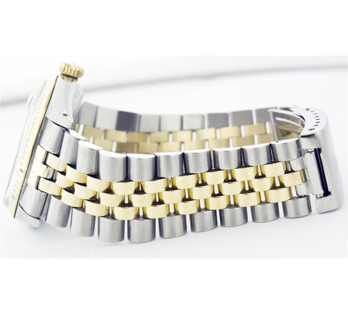One Mens Two Tone Rolex Datejust Polished, Serviced & Electronically Tested, 14K Yellow Gold & Stainless Steel Case: 36mm,14K Yellow Gold Crown, Bezel: 14K Yellow Gold Fluted Bezel. Custom Crystal: Acrylic Cyclops Lens. Movement: Automatic Winding Movement Caliber 3035. Custom Dial: Champagne Dial With Index Hour Markers and Small Track. Color: G Date Window: 3 O'Clock Position Date Display, Quickset, Model: 16013 Condition: G-6 Extra Fine. Bracelet: Two Tone 14K Yellow Gold & Stainless Steel Jubilee. Bright Polish. 6.5 Inch Length, Adjustable. Standard Clasp, With Rolex Logo.