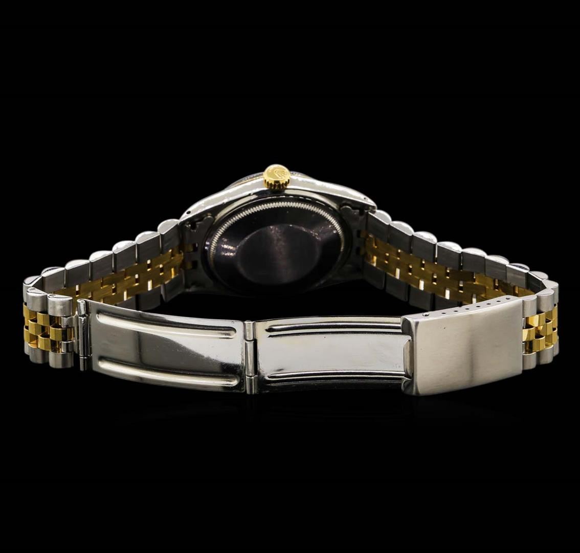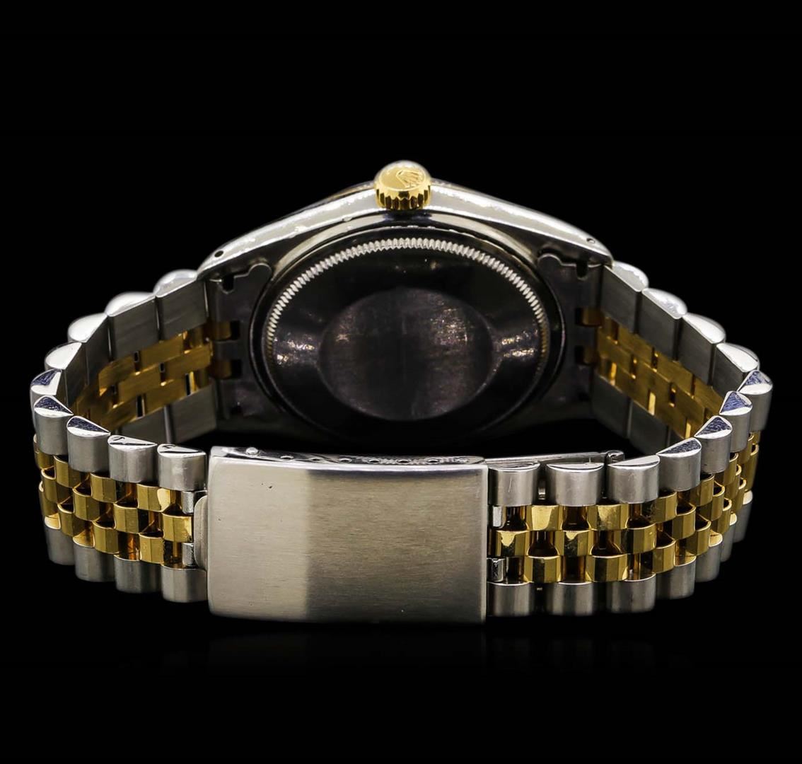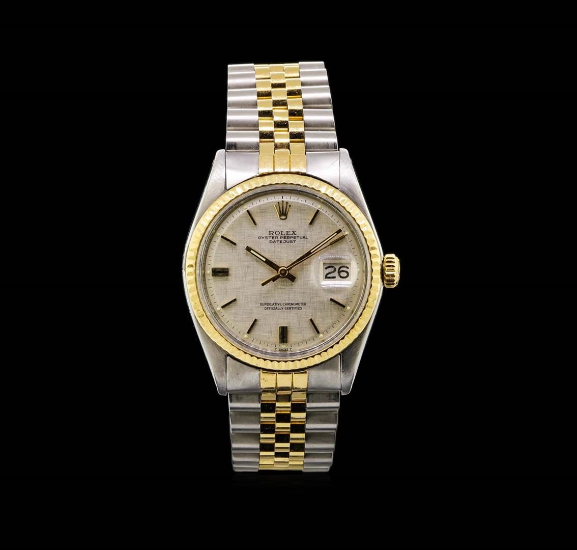 One gents, hand crafted & machine milled Rolex two-tone DateJust model wristwatch electronically tested, Stainless Steel Case: 36mm oyster, Custom Crystal: acrylic cyclops lens, 14KT yellow gold Crown: twinlock with logo, Bezel: 14KT yellow gold fluted, Movement: superlative chronometer. Dial: Silvered Hounds-tooth, with baton hands & indices, Circa: 1969, Date Window: 3 o'clock position non-quick set, Italian Custom Bracelet: two-tone stainless steel & 14KT yellow gold jubilee style, Condition: G-4 Average. Seven and one quarter inch length, adjustable. Standard clasp, with logo. Total Weight of Watch 89.30 grams. AIG Appraised at $6,550.00.