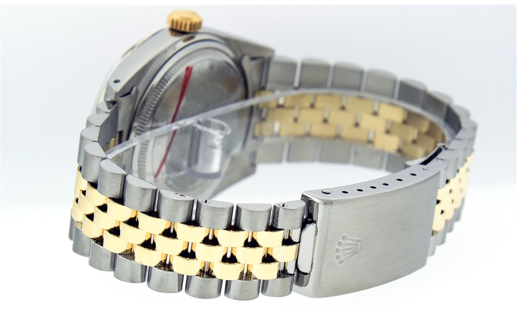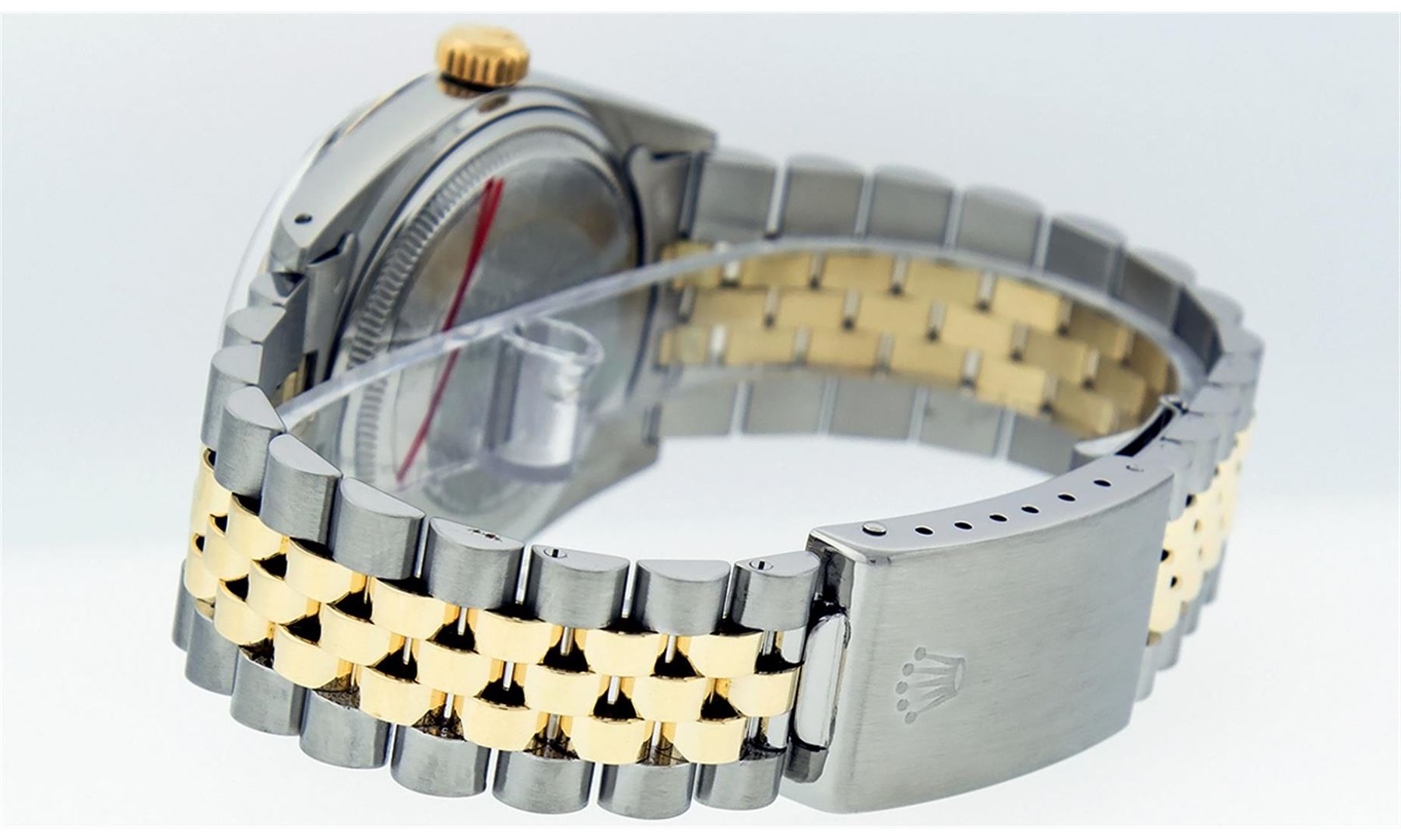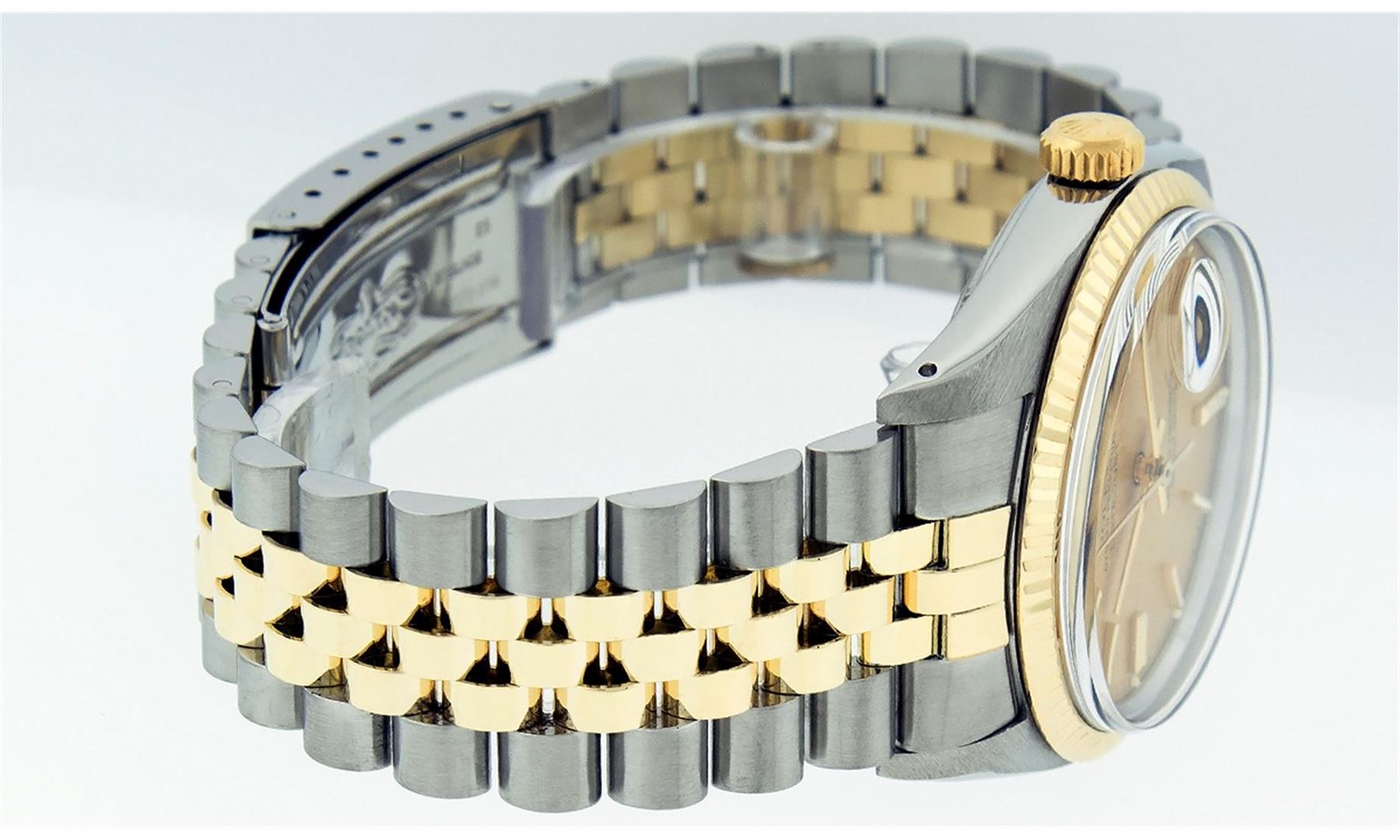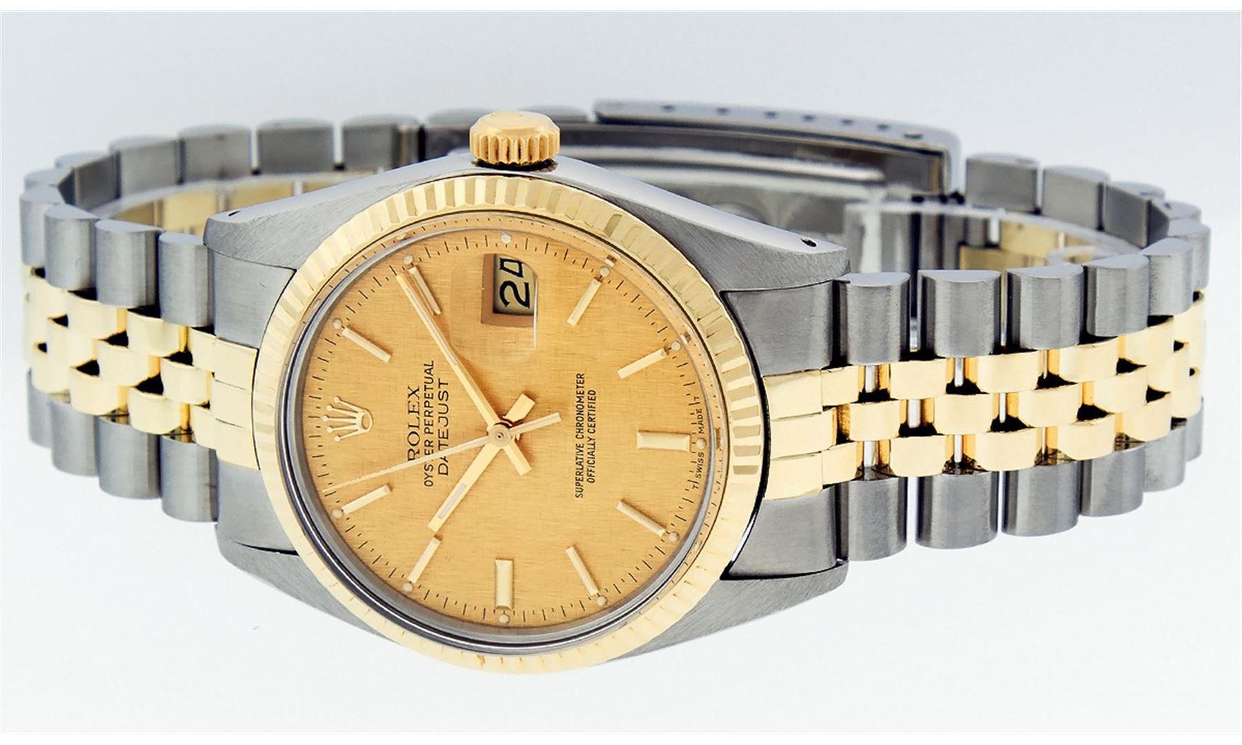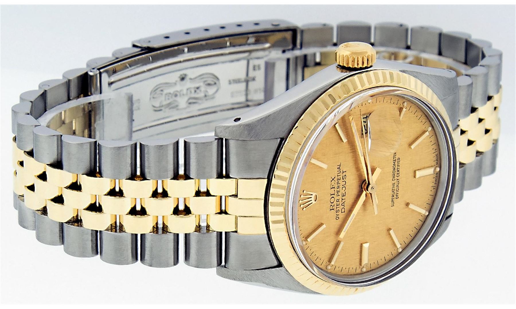 One Mens Two Tone Rolex Datejust Polished, Serviced & Electronically Tested, 14K Yellow Gold & Stainless Steel Case: 36mm,14K Yellow Gold Crown, Bezel: 14K Yellow Gold Fluted Bezel. Custom Crystal: Acrylic Cyclops Lens. Movement: Automatic Winding Movement Caliber 3035. Dial: Champagne Linen Dial With Index Hour Markers and Small Track. Date Window: 3 O'Clock Position Date Display, Quickset, Model: 16013 Condition: G-6 Extra Fine The Watch Is In Very Good Condition Free Of All Scratches And Dents. Bracelet: Two Tone 14K Yellow Gold & Stainless Steel Jubilee. Bright Polish. 7.0 Inch Length, Adjustable. Standard Clasp, With Rolex Logo. Comes with 6 month warranty.
