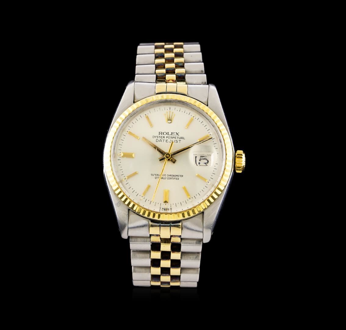One Rolex Oyster Perpetual DateJust watch featuring: Movement: Automatic. Case: Stainless steel and yellow gold. Bezel: Yellow gold fluted. Crystal: Sapphire. Dial: Silver color; yellow gold index hour markers. Features: Date window located at the 3 o'clock position. Bracelet: Stainless steel and yellow gold with deployment clasp. Condition: Significant surface scratches on case and crystal; good working order.