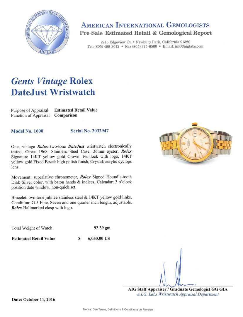 One, vintage Rolex two-tone DateJust wristwatch electronically tested, Circa: 1968, Stainless Steel Case: 36mm oyster, Rolex Signature 14KT yellow gold Crown: twinlock with logo, 14KT yellow gold Fixed Bezel: high polish finish, Crystal: acrylic cyclops lens. Movement: superlative chronometer, Rolex Signed Hound's-tooth Dial: Silver color, with baton hands & indices, Calendar: 3 o'clock position date window, non-quick set. Bracelet: two-tone jubilee stainless steel & 14KT yellow gold links, Condition: G-5 Fine. Seven and one quarter inch length, adjustable. Rolex Hallmarked clasp with logo. Total Weight of Watch 92.39gm. AIG Appraised at $6,050.00.
