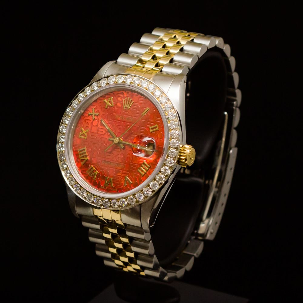 ****** Rolex Two-Tone DateJust 36mm Custom Diamond Dial aprox. 2.25CT Men's Wristwatch ****** One Mens, Rolex Two-Tone DateJust 36mm Custom Diamond Dial aprox. 2.25 CT electrolically tested and polished. Case: Gold/ SS 36mm / Dial: Red, Diamond aprox. 2.25 ct / Bracelet: Gold/SS standard clasp with logo / Condition: Pre-owned / good.