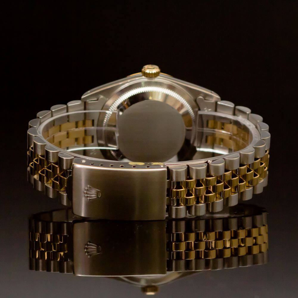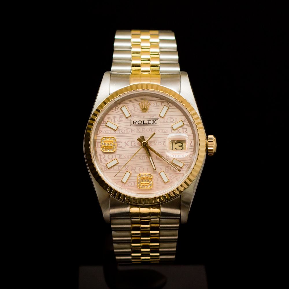 ****** Rolex Two-Tone Datejust 36mm Custom Pink Dial, Diamonds on 9th & 6th Hour Men's Wristwatch ****** One Mens, Rolex Two-Tone DateJust 36mm electronically tested and polished. Case: Gold/Stainless Steel, 36mm. Bezel: Yellow Gold. Dial: "Rolex". Bracelet: Gold/Steel. Standard clasp, with logo. Condition: Preowned / Good. /