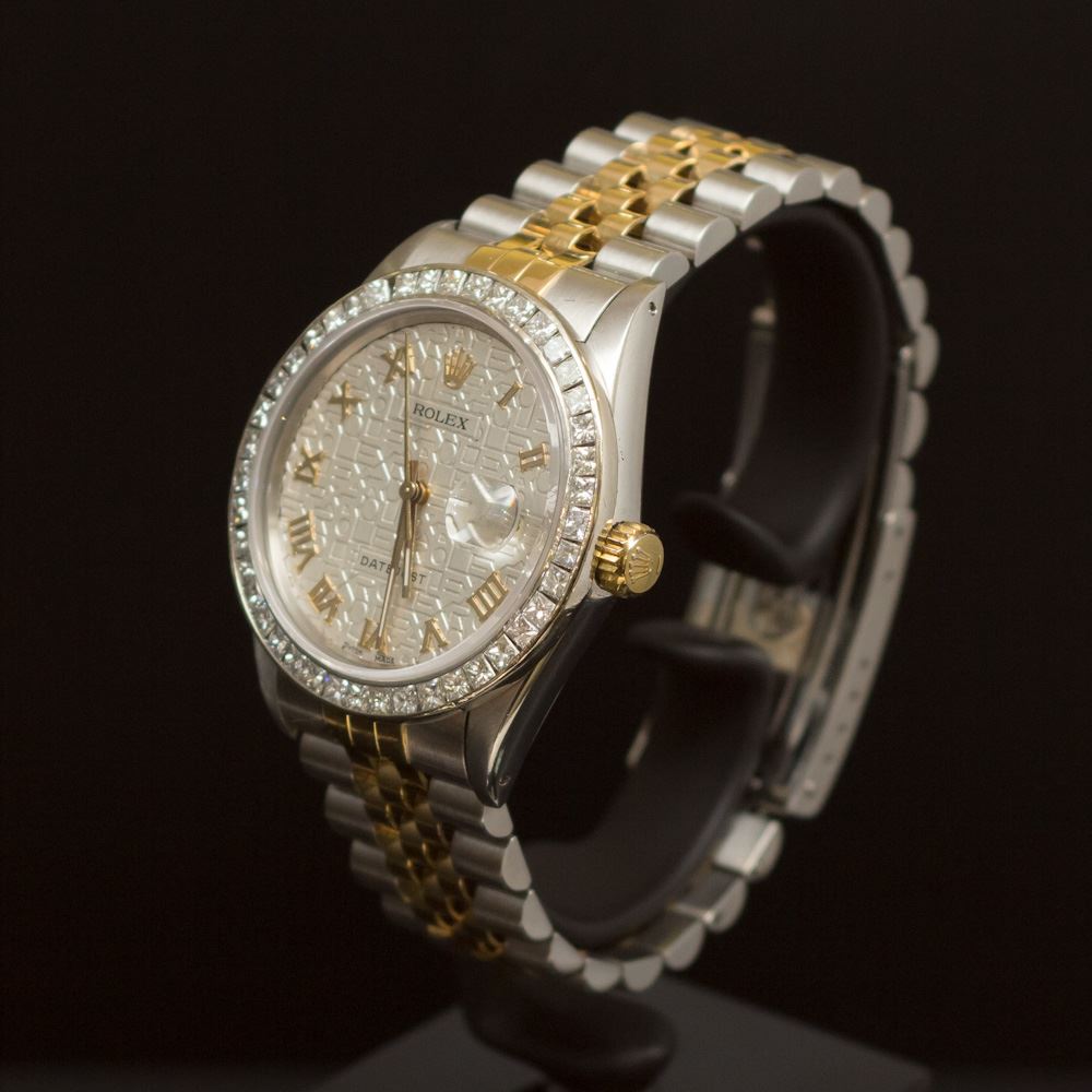 ****** Rolex Two-Tone Datejust 36mm Custom Silver Jubeele Dial with Gold Roman Numerals, Bezel 2.25ct Men's Wristwatch****** One Mens, Rolex Two-Tone DateJust 36mm electronically tested and polished. Case: Gold/Stainless Steel, 36mm. Bezel: 2.25 ct / Princess Cut Diamonds / Dial: Custom Silver Jubeele with Gold Roman Numerals / Bracelet: Gold/Steel. Standard clasp, with logo. Condition: Preowned / Good. /