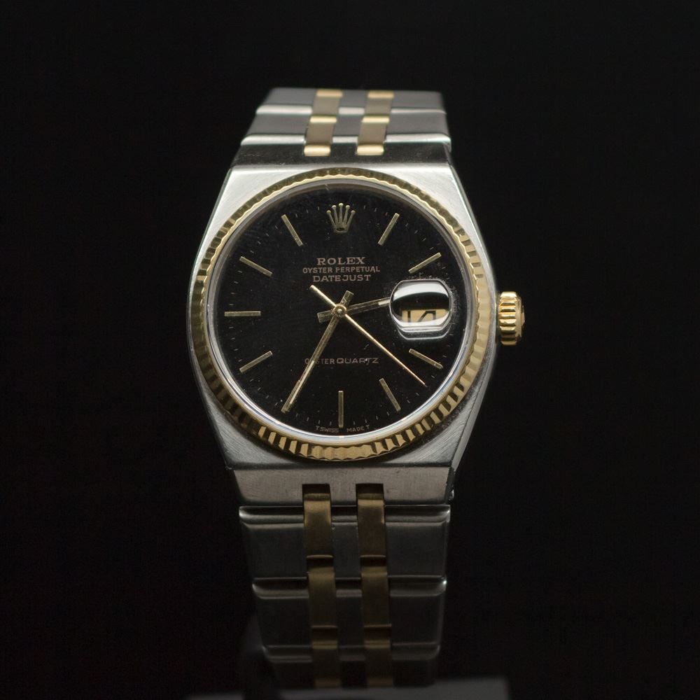 ****** Rolex Two-Tone Datejust Quartz Vintage 36mm Black Index Dial Men's Wristwatch ****** One Mens, Rolex Two-Tone DateJust Quartz Vintage 36mm electronically tested and polished. Case: Stainless Steel, 36mm. Bezel: Gold. Dial: Black Index / Bracelet: Gold/Steel. Standard clasp, with logo. Condition: Preowned / Good. /