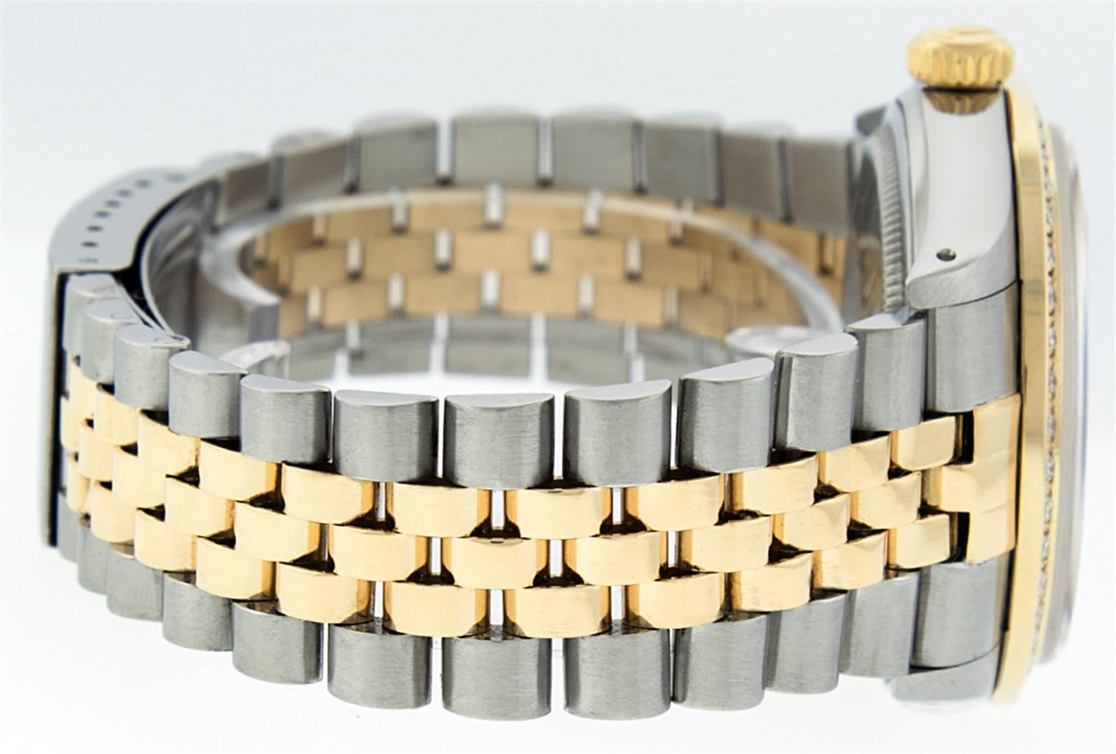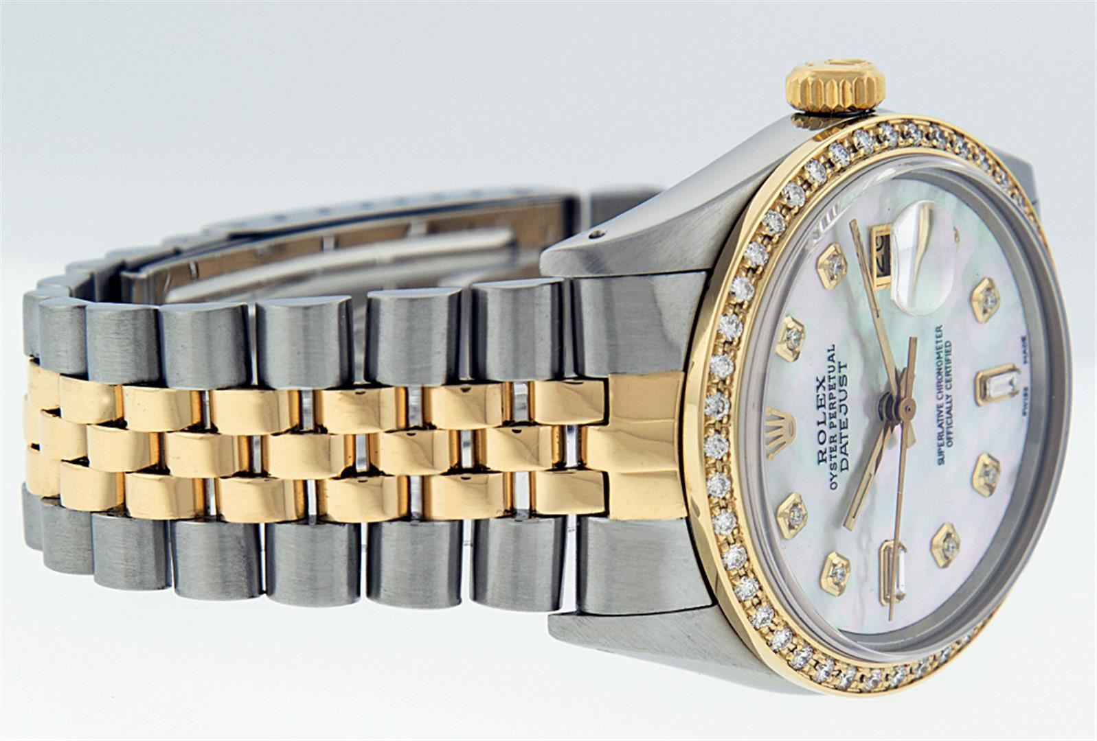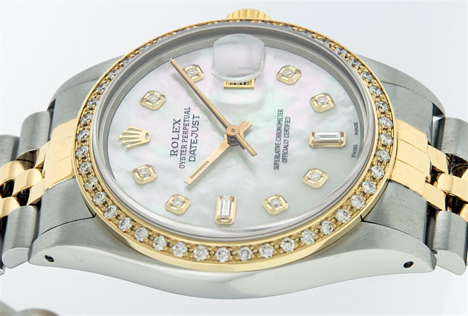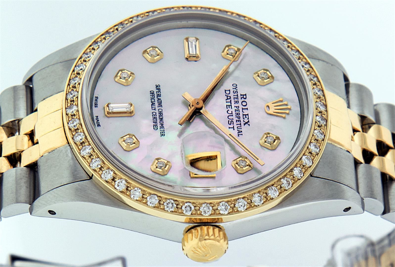 One Mens Two Tone Rolex Datejust Polished, Serviced & Electronically Tested, 18K Yellow Gold & Stainless Steel Case:36mm, 18K Yellow Gold Crown, Custom Bezel: 18K Yellow Gold Beadset Diamond Bezel, Diamond Count: 44 Diamonds Total Weight 1.0 Carat, Clarity: Si-VS, Color: G to H. Custom Crystal: Synthetic Sapphire Cyclops Lens. Movement: Automatic Winding Movement Caliber 3135. Custom Dial: Mother Of Pearl Diamond + Baguette Dial, Diamond Count: 8 Diamonds + 2 Baguette, Color: G to H, Clarity: SI-VS Date Window: 3 O'Clock Position Date Display, Quickset, Model: 16233 Sapphire Datejust. Condition: G-6 Extra Fine. Bracelet: Two Tone 18K Yellow Gold & Stainless Steel Jubilee. Bright Polish. 7.0 Inch Length, Adjustable. Standard Clasp, With Rolex Logo.