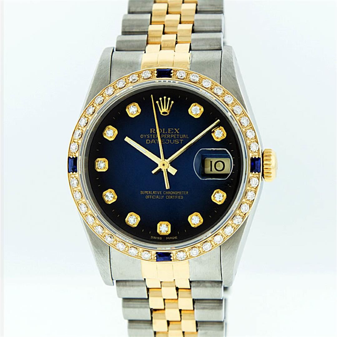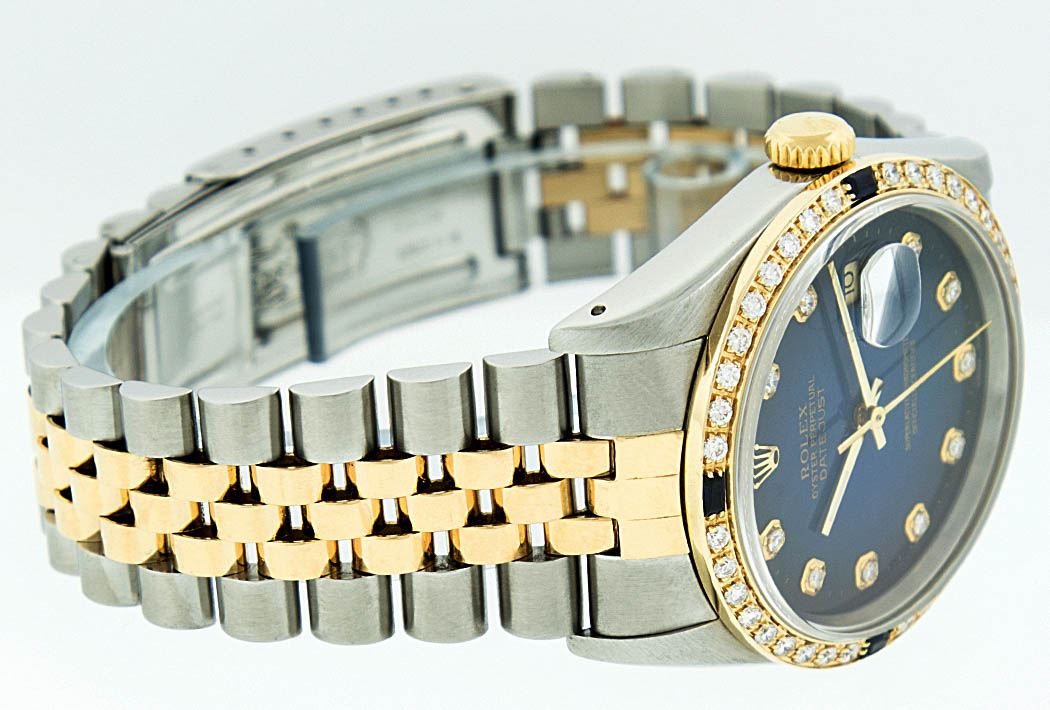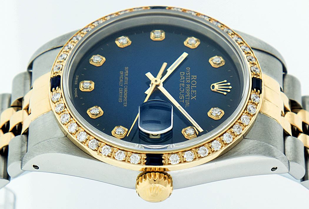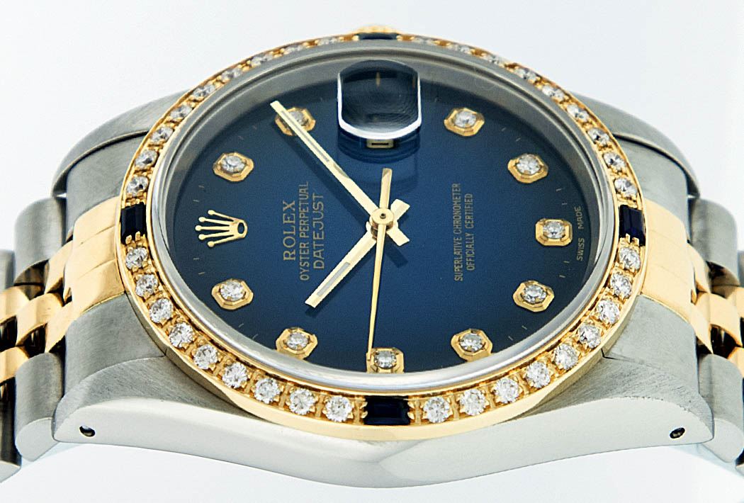 One Mens Two Tone Rolex Datejust Polished, Serviced & Electronically Tested, 14K Yellow Gold & Stainless Steel Case:36mm, 14K Yellow Gold Crown, Custom Bezel: 18K Yellow Gold Sapphire Beadset Diamond Bezel, Diamond Count: 36 Diamonds + 4 Sapphires Total Weight 1.00 Carat, Clarity: Si-VS, Color: G to H. Custom Crystal: Synthetic Sapphire Cyclops Lens. Movement: Automatic Winding Movement Caliber 3035. Custom Dial: Blue Vignette With Diamond Hour Markers. Diamond Count: 10 Diamonds Clarity: SI-VS, Color: Color G to H Date Window: 3 O'Clock Position Date Display, Quickset, Model: 16013 Condition: G-6 Extra Fine. Bracelet: Two Tone 14K Yellow Gold & Stainless Steel Jubilee. Bright Polish. 6.5 Inch Length, Adjustable. Standard Clasp, With Rolex Logo.