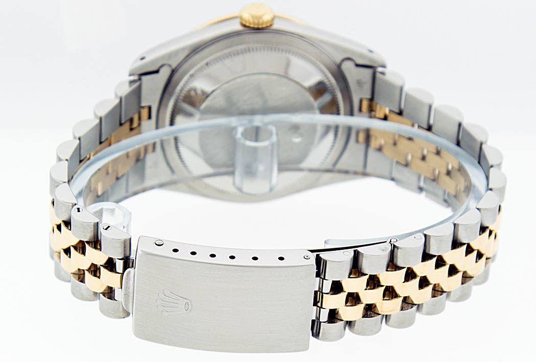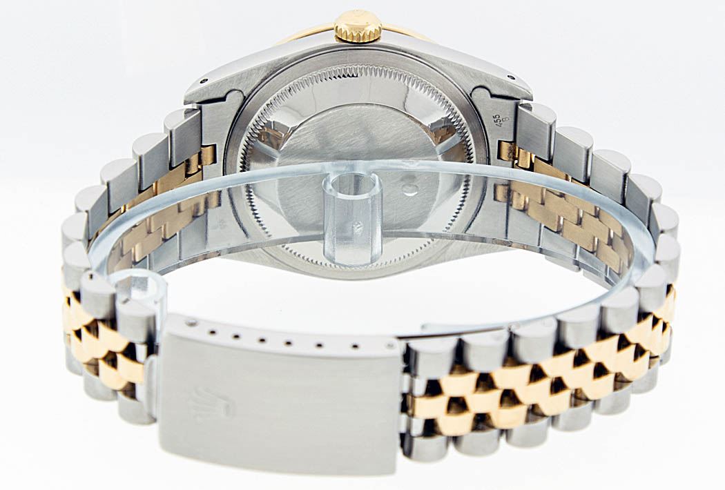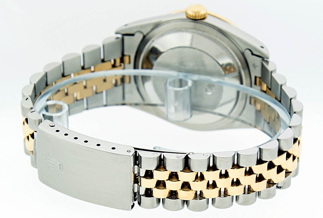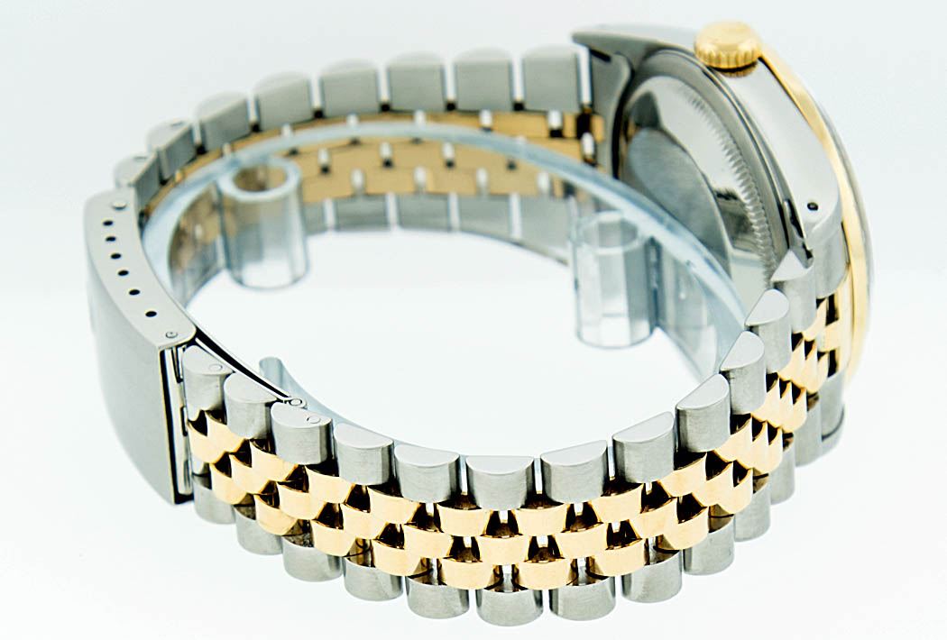 One Mens Two Tone Rolex Datejust Polished, Serviced & Electronically Tested, 14K Yellow Gold & Stainless Steel Case:36mm, 14K Yellow Gold Crown, Custom Bezel: 18K Yellow Gold Sapphire Beadset Diamond Bezel, Diamond Count: 36 Diamonds + 4 Sapphires Total Weight 1.00 Carat, Clarity: Si-VS, Color: G to H. Custom Crystal: Synthetic Sapphire Cyclops Lens. Movement: Automatic Winding Movement Caliber 3035. Custom Dial: Blue Vignette With Diamond Hour Markers. Diamond Count: 10 Diamonds Clarity: SI-VS, Color: Color G to H Date Window: 3 O'Clock Position Date Display, Quickset, Model: 16013 Condition: G-6 Extra Fine. Bracelet: Two Tone 14K Yellow Gold & Stainless Steel Jubilee. Bright Polish. 6.5 Inch Length, Adjustable. Standard Clasp, With Rolex Logo.