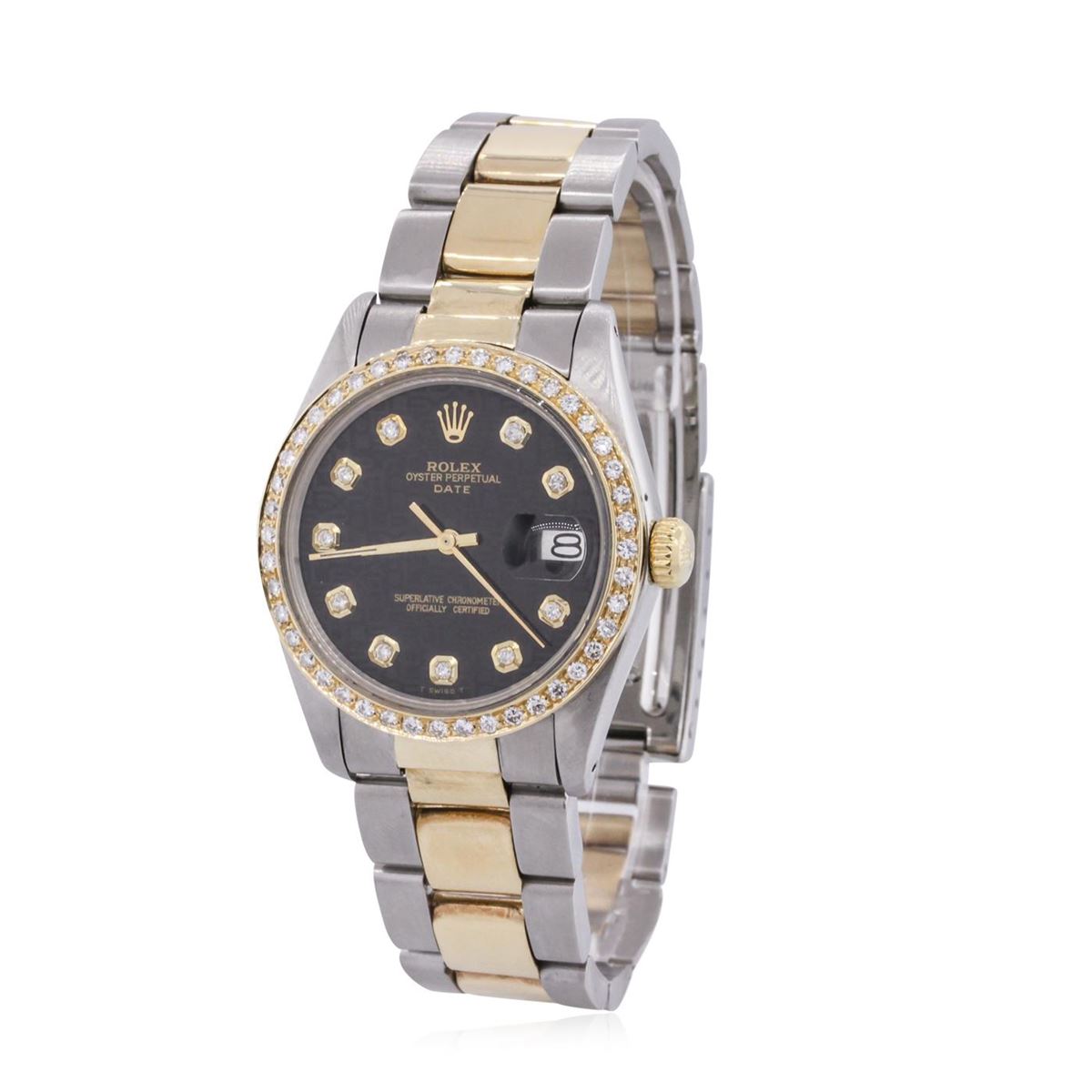 One gents, hand crafted & machine milled vintage Rolex Date Model wristwatch electronically tested, stainless steel, Case: 35mm oyster, 14KT yellow gold Crown: twin lock with logo, Custom Bezel: diamond set, Crystal: acrylic cyclops lens. Movement: superlative chronometer, Custom Dial: Black color, baton hands and diamond markers, Calendar: non-quick set, Bracelet: 14KT yellow gold & stainless steel jubilee, Condition: G-4 Average. Circa: 1979, Eight inch length, adjustable. Three removable links. Standard clasp, with logo. Containing: Forty Four prong set round brilliant cut diamonds, measuring an average of 1.70mm in diameter, approximate total weight of 44 Stones = 0.88ct. Set & graded in the bezel. Clarity: VS-2 to SI-2 Average. Color: H - I. Total Weight of Diamonds 0.88ct. Total Weight of Watch 98.97 grams. AIG Appraised at $8,550.00.