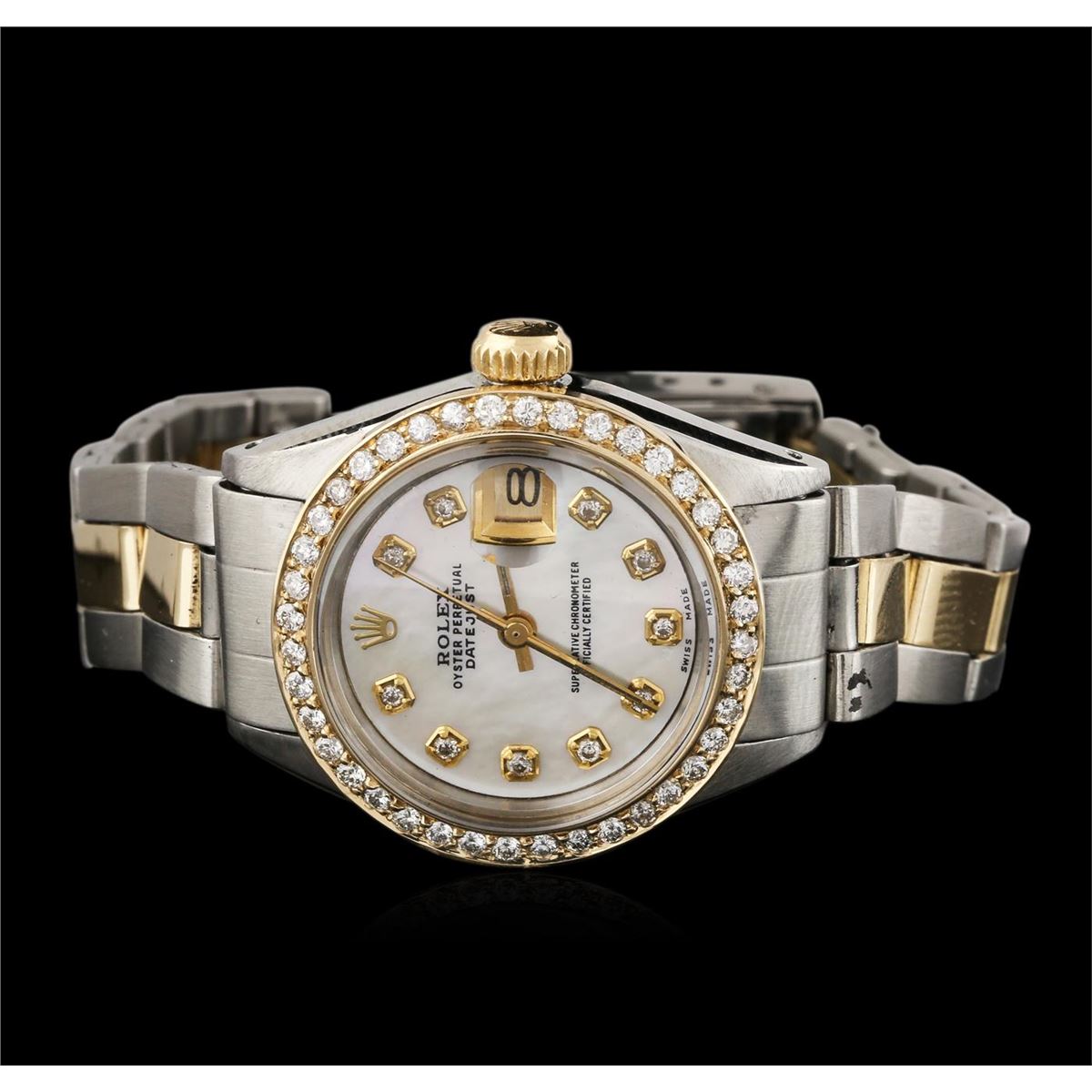One ladies, hand crafted & machine milled Rolex DateJust Model wristwatch electronically tested, Stainless Steel Case: 26mm oyster, 14KT yellow gold Crown: twinlock with logo, Custom Bezel: diamond set, Custom Crystal: acrylic clops lens. Movement: superlative chronometer. Custom Dial: light mother of pearl, with baton hands, and diamond markers, Date Window: 3 o'clock position date display, non-quick set, Circa: 1973, Condition: G-4 Average. Bracelet: stainless steel and 14KT yellow gold oyster. Bright polish & brushed finish. Six and one half inch length, adjustable. Standard clasp, with logo. Containing: Forty round brilliant cut diamonds, 1.65mm in diameter average, approximate. Total Weight of 40 stones = 0.52ct. Set and graded in the bezel. Clarity: SI-1 to I-1. Color: F - H. Total Weight of Diamonds 0.52ct. Total Weight of Watch 46.07 grams. AIG Appraised at $8,050.00.