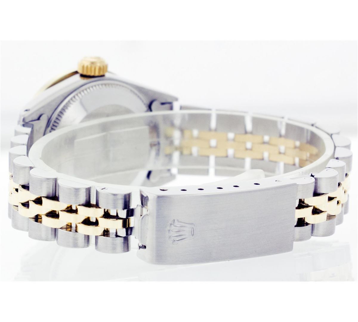 One Ladies Two Tone Rolex Datejust Polished, Serviced & Electronically Tested, 14K Yellow Gold & Stainless Steel Case: 26mm, 14K Yellow Gold Crown, Custom Bezel: 18K Yellow Gold Beadset Diamond Bezel, Diamond Count: 32 Diamonds Total Weight .70 Carat, Clarity: Si-VS, Color: G to H. Custom Crystal: Synthetic Sapphire Cyclops Lens. Movement: Automatic Winding Movement Caliber 2030. Custom Dial: Silver Dial Set With Diamond Hour Markers, 10 Diamond in Dial G To H In Color, Si-VS Clarity. Date Window: 3 O'Clock Position Date Display, Non Quickset, Model: 6917 Condition: G-6 Extra Fine. Bracelet: Two Tone 14K Yellow Gold & Stainless Steel Jubilee. Bright Polish. 5.5 Inch Length, Adjustable. Standard Clasp, With Rolex Logo.