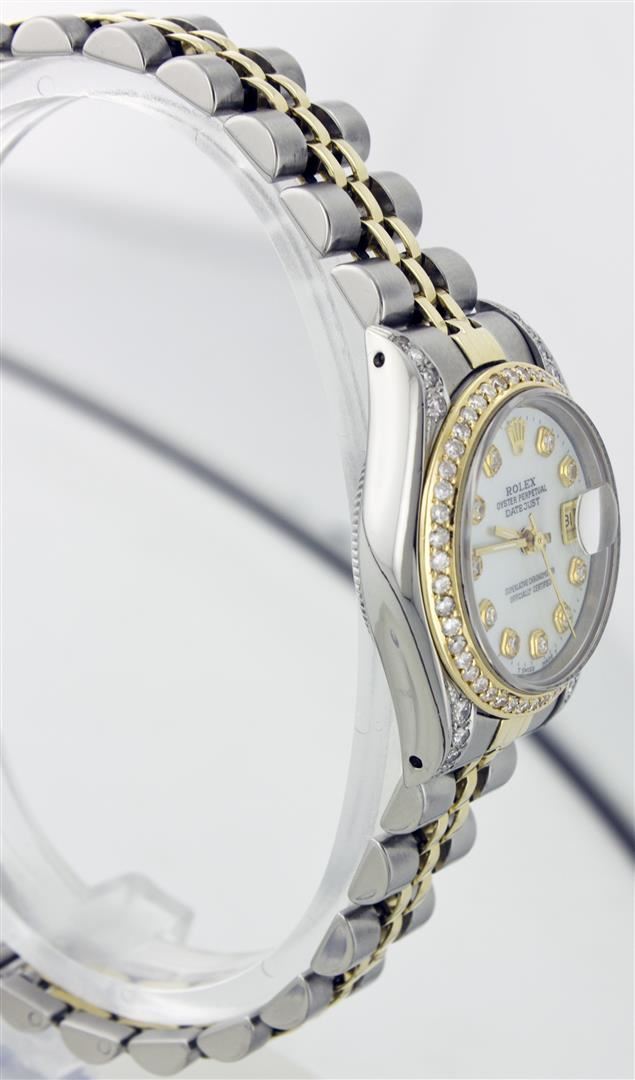 One Ladies Two Tone Rolex Datejust Polished, Serviced & Electronically Tested, 14K Yellow Gold & Stainless Steel Case:26mm, 14K Yellow Gold Crown, Custom Bezel: 18K Yellow Gold Beadset Diamond Bezel, Diamond Count: 32 Diamonds Total Weight .70 Carat, Clarity: Si-VS, Color: G to H. Custom Crystal: Synthetic Sapphire Cyclops Lens. Movement: Automatic Winding Movement Caliber 2030. Custom Dial: Mother Of Pearl With Diamond Hour Markers, Diamond Count: 10 Diamonds, Clarity: SI-VS, Color: G to H. Date Window: 3 O'Clock Position Date Display, Non Quickset, Model: 6917 Condition: G-6 Extra Fine. Bracelet: Two Tone 14K Yellow Gold & Stainless Steel Jubilee. Bright Polish. 5.5 Inch Length, Adjustable. Standard Clasp, With Rolex Logo.