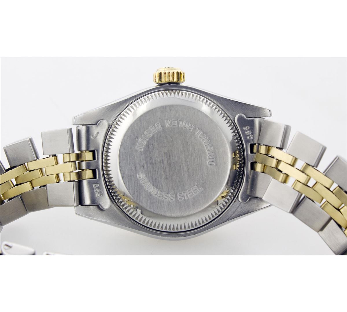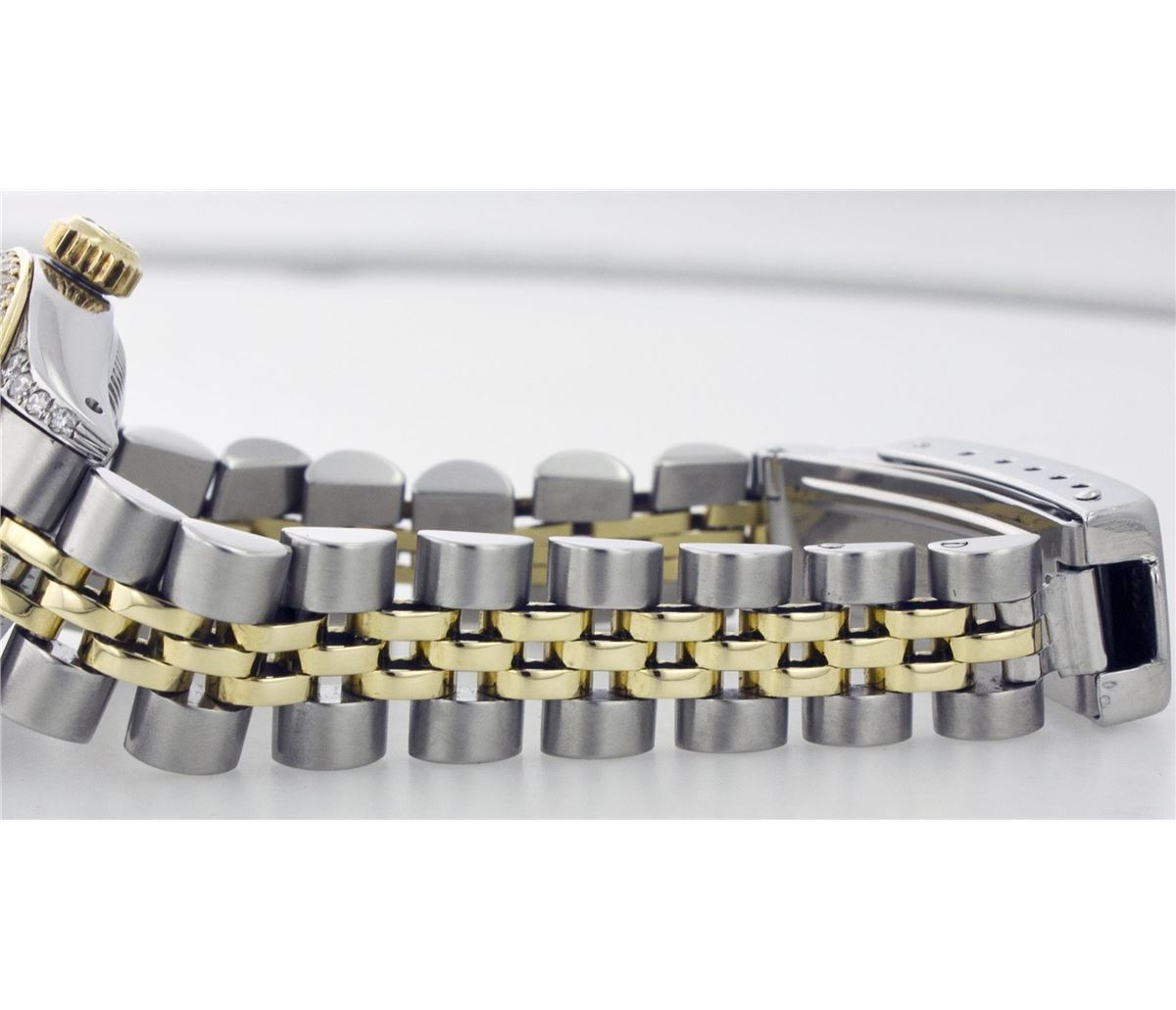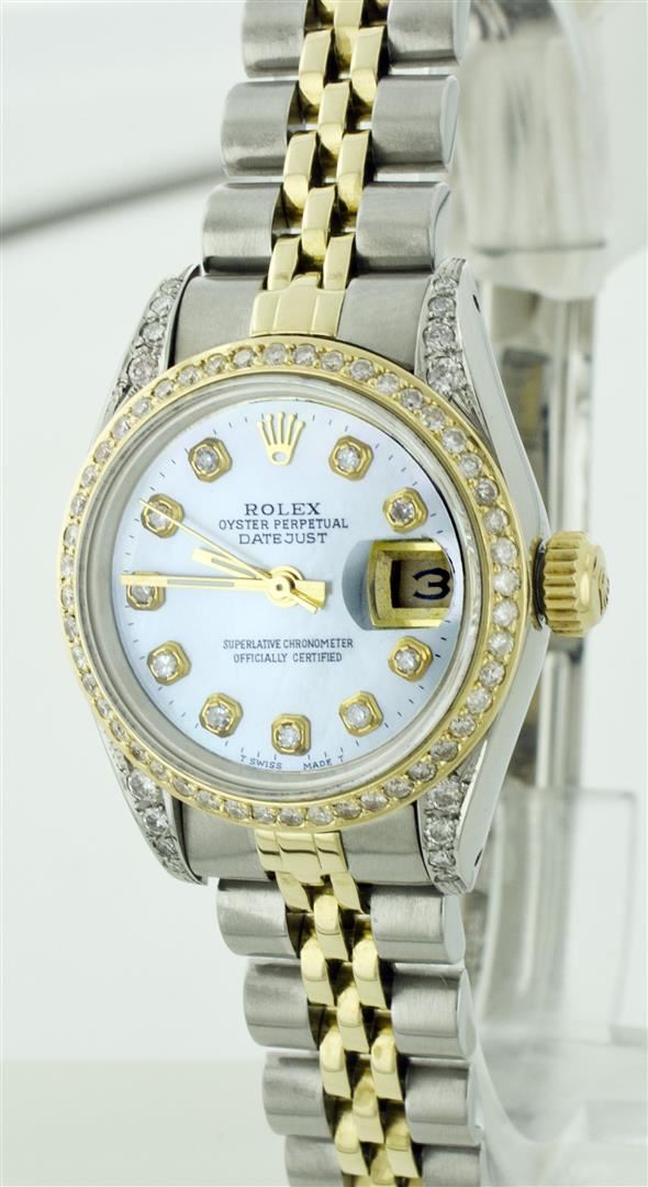 One Ladies Two Tone Rolex Datejust Polished, Serviced & Electronically Tested, 14K Yellow Gold & Stainless Steel Case:26mm, 14K Yellow Gold Crown, Custom Bezel: 18K Yellow Gold Beadset Diamond Bezel, Diamond Count: 32 Diamonds Total Weight .70 Carat, Clarity: Si-VS, Color: G to H. Custom Crystal: Synthetic Sapphire Cyclops Lens. Movement: Automatic Winding Movement Caliber 2030. Custom Dial: Mother Of Pearl With Diamond Hour Markers, Diamond Count: 10 Diamonds, Clarity: SI-VS, Color: G to H. Date Window: 3 O'Clock Position Date Display, Non Quickset, Model: 6917 Condition: G-6 Extra Fine. Bracelet: Two Tone 14K Yellow Gold & Stainless Steel Jubilee. Bright Polish. 5.5 Inch Length, Adjustable. Standard Clasp, With Rolex Logo.