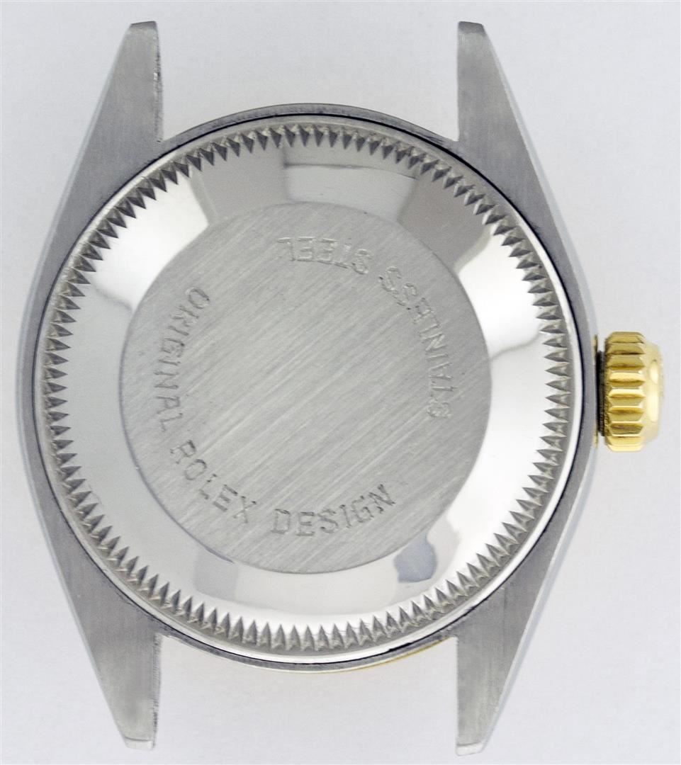 One Ladies Two Tone Rolex Datejust Polished, Serviced & Electronically Tested, 14K Yellow Gold & Stainless Steel Case:26mm, 14K Yellow Gold Crown, Bezel: 14K Yellow Gold Fluted Bezel. Custom Crystal: Synthetic Sapphire Cyclops Lens. Movement: Automatic Winding Movement Caliber 2030. Custom Dial: Blue Vignette With Diamond Dial, Diamond Count: 10 Diamonds, Clarity: SI-VS, Color: G To H. Date Window: 3 O'Clock Position Date Display, Non Quickset, Model: 6917 Condition: G-6 Extra Fine. Bracelet: Two Tone 14K Yellow Gold & Stainless Steel Jubilee. Bright Polish. 5.5 Inch Length, Adjustable. Standard Clasp, With Rolex Logo.