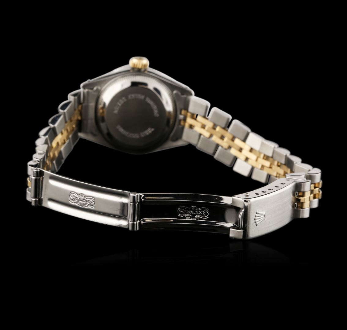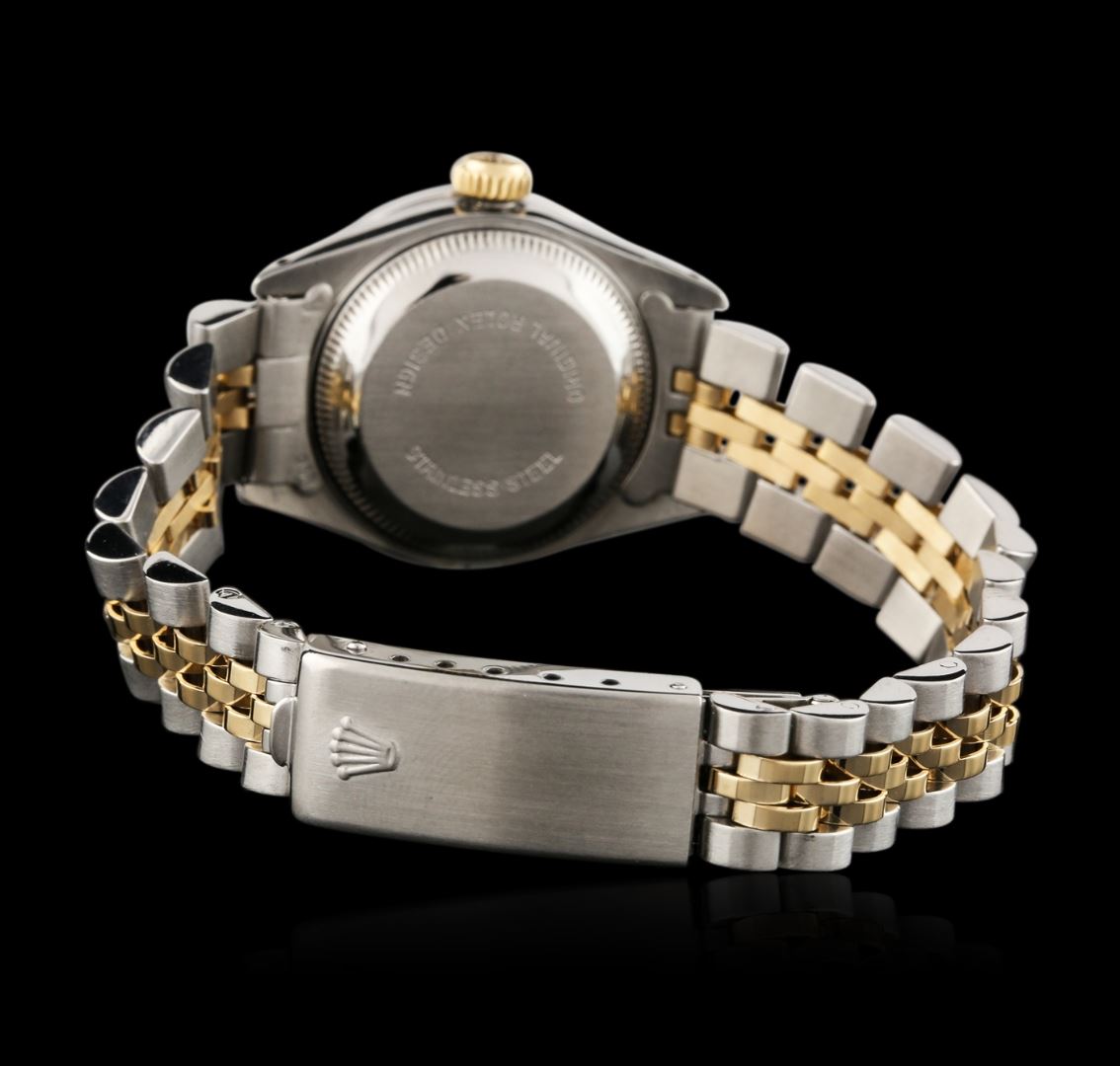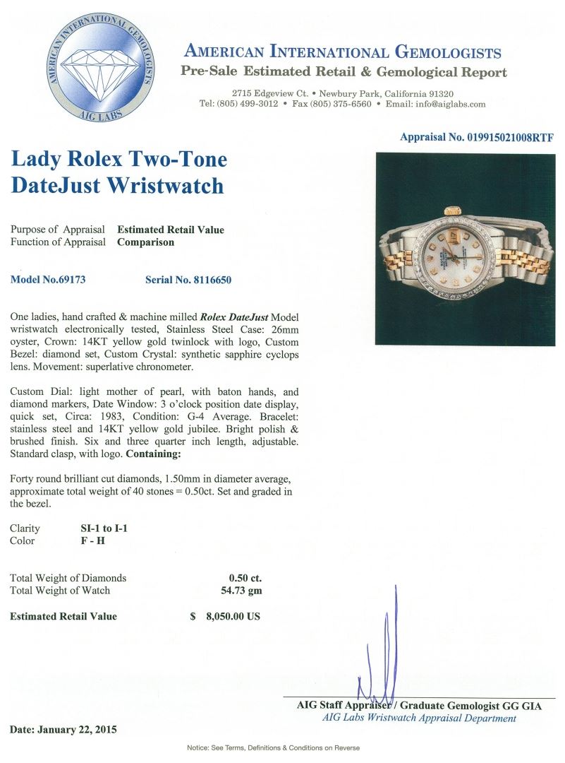 One ladies, hand crafted & machine milled Rolex DateJust Model wristwatch electronically tested, Stainless Steel Case: 26mm oyster, Crown: 14KT yellow gold twinlock with logo, Custom Bezel: diamond set, Custom Crystal: synthetic sapphire cyclops lens. Movement: superlative chronometer. Custom Dial: light mother of pearl, with baton hands, and diamond markers, Date Window: 3 o'clock position date display, quick set, Circa: 1983, Condition: G-4 Average. Bracelet: stainless steel and 14KT yellow gold jubilee. Bright polish & brushed finish. Six and three quarter inch length, adjustable. Standard clasp, with logo. Containing: Forty round brilliant cut diamonds, 1.50mm in diameter average, approximate. Total Weight of 40 stones = 0.50ct. Set and graded in the bezel. Clarity: SI-1 to I-1. Color: F - H. Total Weight of Diamonds 0.50ct. Total Weight of Watch 54.73 grams. AIG Appraised at $8,050.00.