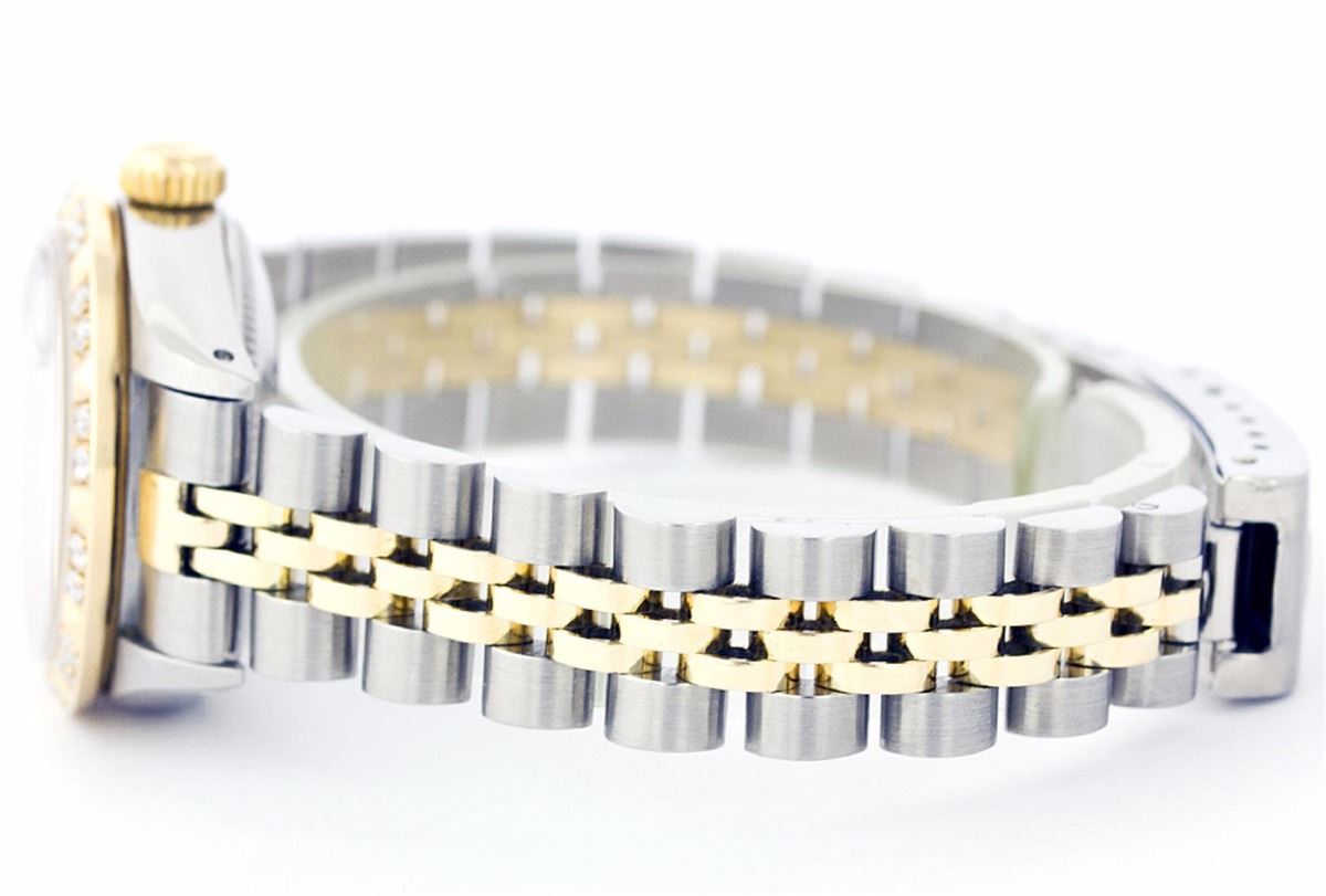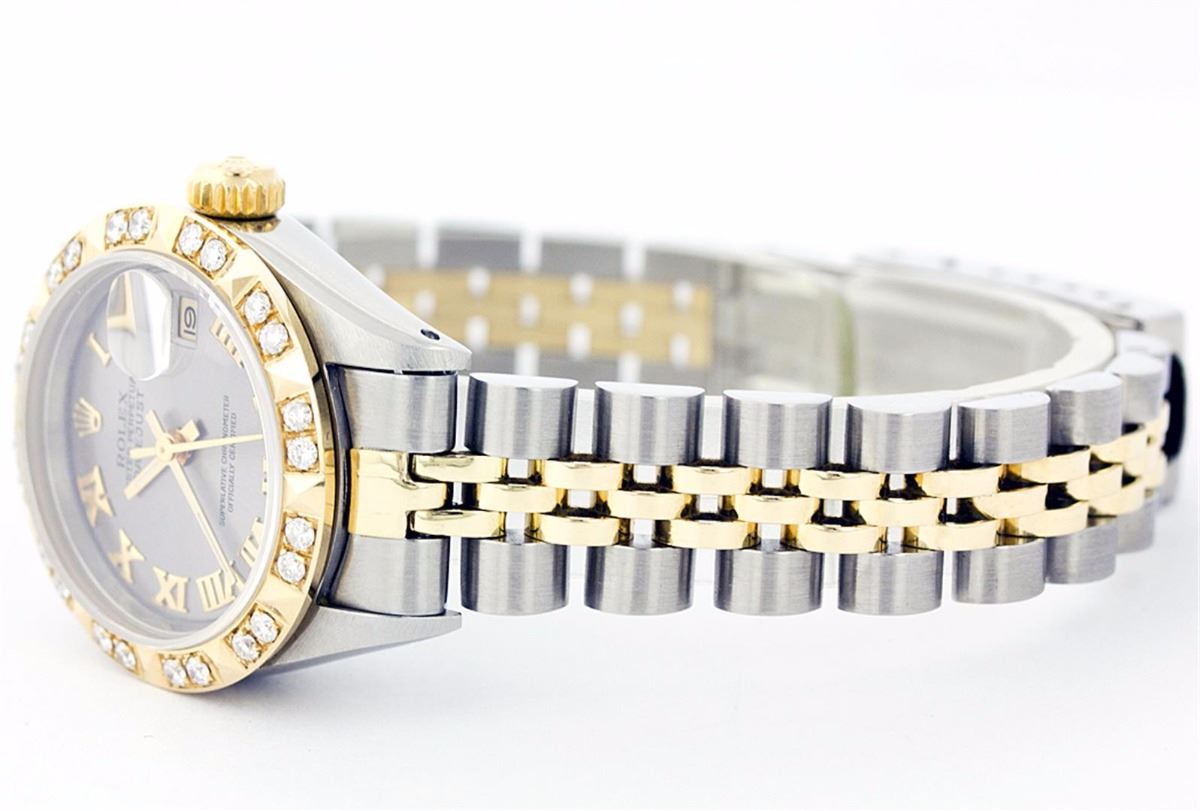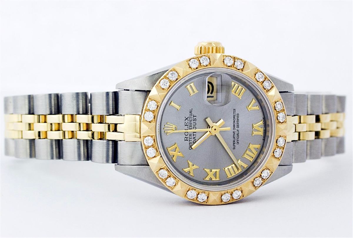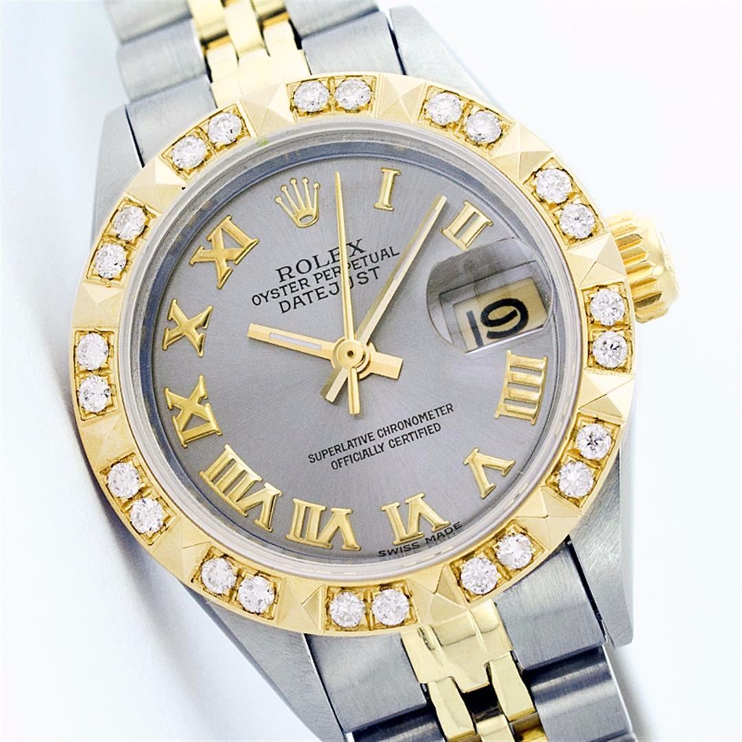 One Ladies Two Tone Rolex Datejust Polished, Serviced & Electronically Tested, 14K Yellow Gold & Stainless Steel Case:26mm, 14K Yellow Gold Crown, Custom Bezel: 18K Yellow Gold Pyramid Diamond Bezel, Diamond Count: 24 Diamonds Total Weight .50 Carat, Clarity: Si-VS, Color: G to H. Custom Crystal: Synthetic Sapphire Cyclops Lens. Movement: Automatic Winding Movement Caliber 2030. Custom Dial: Slate Grey With Roman Hour Markers. Date Window: 3 O'Clock Position Date Display, Non Quickset, Model: 6917 Condition: G-6 Extra Fine. Bracelet: Two Tone 14K Yellow Gold & Stainless Steel Jubilee. Bright Polish. 5.5 Inch Length, Adjustable. Standard Clasp, With Rolex Logo.