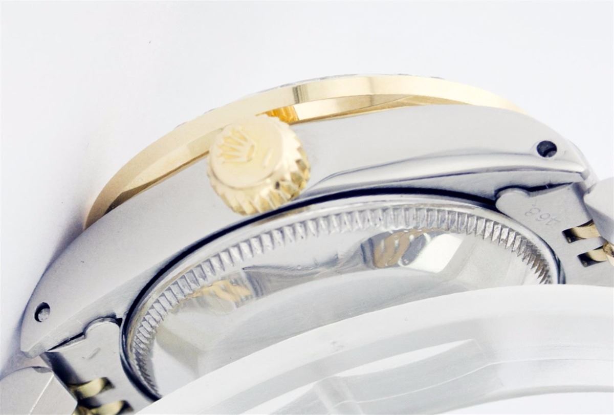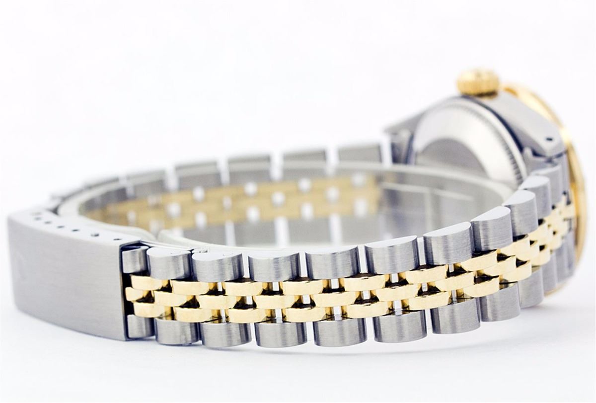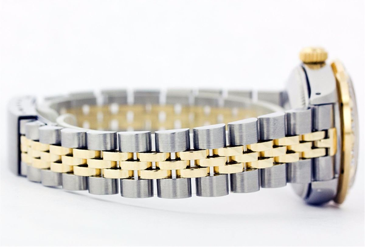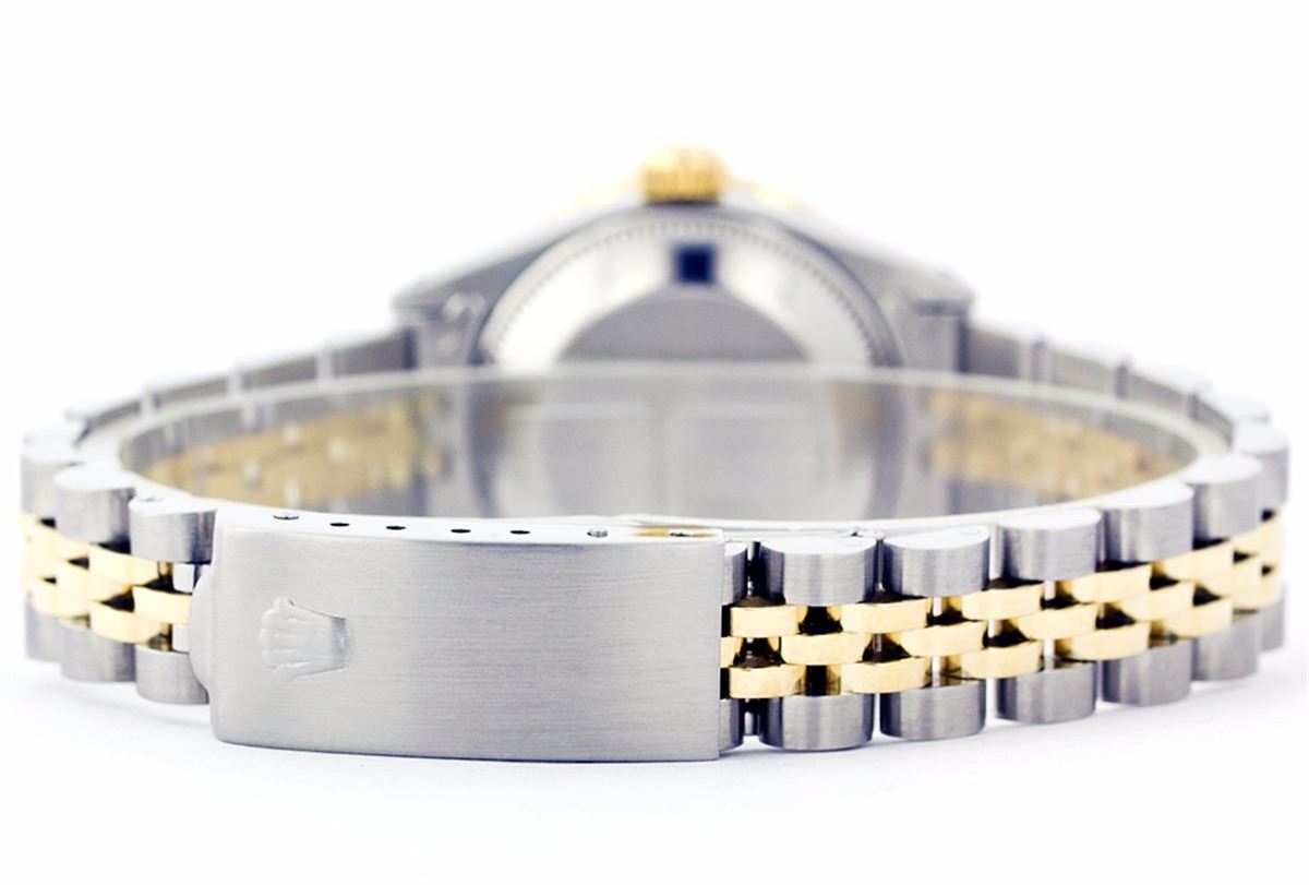 One Ladies Two Tone Rolex Datejust Polished, Serviced & Electronically Tested, 14K Yellow Gold & Stainless Steel Case:26mm, 14K Yellow Gold Crown, Custom Bezel: 18K Yellow Gold Pyramid Diamond Bezel, Diamond Count: 24 Diamonds Total Weight .50 Carat, Clarity: Si-VS, Color: G to H. Custom Crystal: Synthetic Sapphire Cyclops Lens. Movement: Automatic Winding Movement Caliber 2030. Custom Dial: Slate Grey With Roman Hour Markers. Date Window: 3 O'Clock Position Date Display, Non Quickset, Model: 6917 Condition: G-6 Extra Fine. Bracelet: Two Tone 14K Yellow Gold & Stainless Steel Jubilee. Bright Polish. 5.5 Inch Length, Adjustable. Standard Clasp, With Rolex Logo.