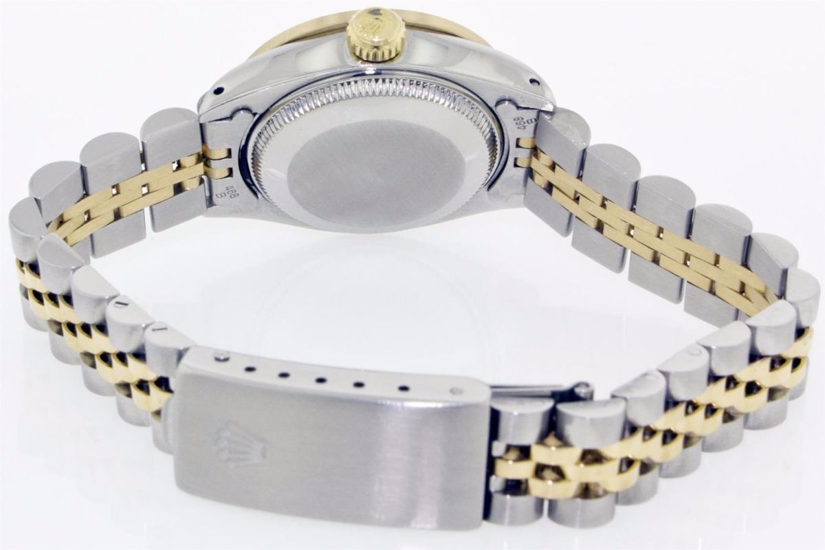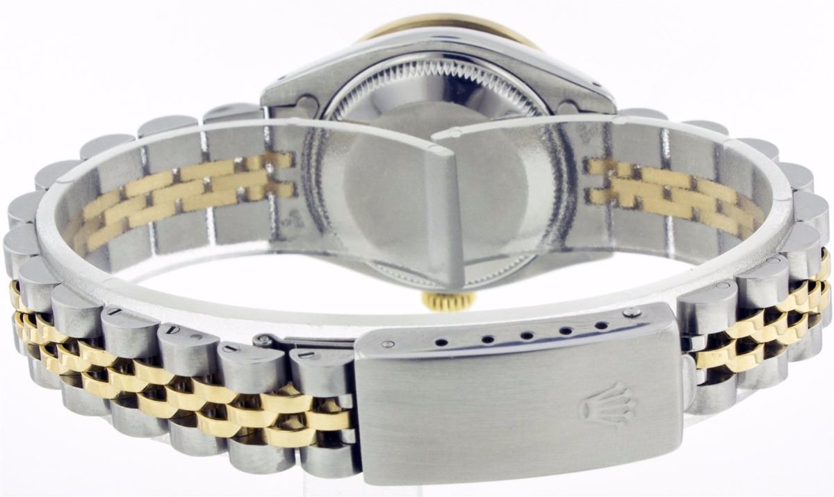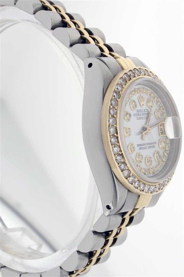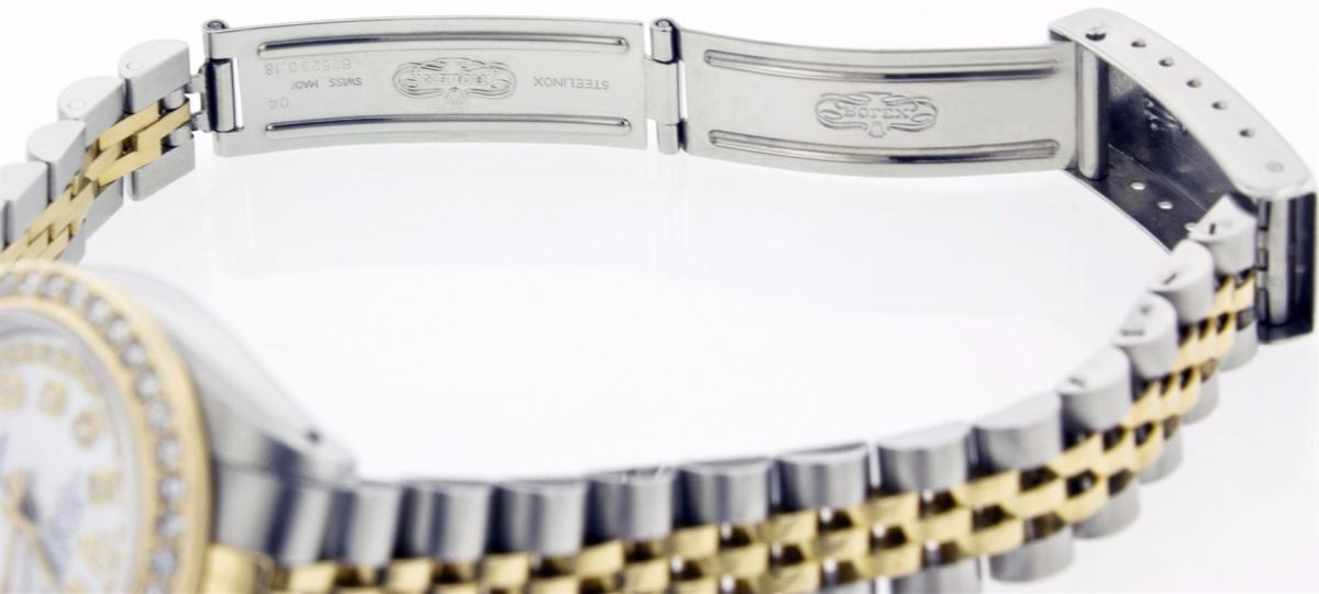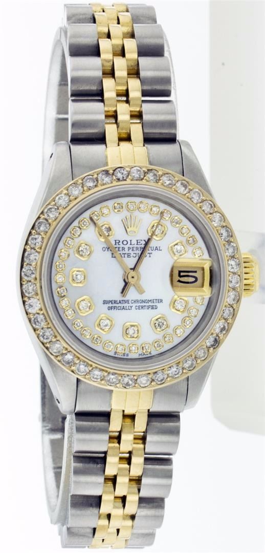 One Ladies Two Tone Rolex Datejust Polished, Serviced & Electronically Tested, 14K Yellow Gold & Stainless Steel Case:26mm, 14K Yellow Gold Crown, Custom Bezel: 18K Yellow Gold Beadset Diamond Bezel, Diamond Count: 32 Diamonds Total Weight .70 Carat, Clarity: Si-VS, Color: G to H. Custom Crystal: Synthetic Sapphire Cyclops Lens. Movement: Automatic Winding Movement Caliber 2030. Custom Dial: Mother Of Pearl String Diamond Dial, Diamond Count: 43 Diamonds, Clarity: SI-VS, Color: G to H. Date Window: 3 O'Clock Position Date Display, Non Quickset, Model: 6917 Condition: G-6 Extra Fine. Bracelet: Two Tone 14K Yellow Gold & Stainless Steel Jubilee. Bright Polish. 5.5 Inch Length, Adjustable. Standard Clasp, With Rolex Logo.