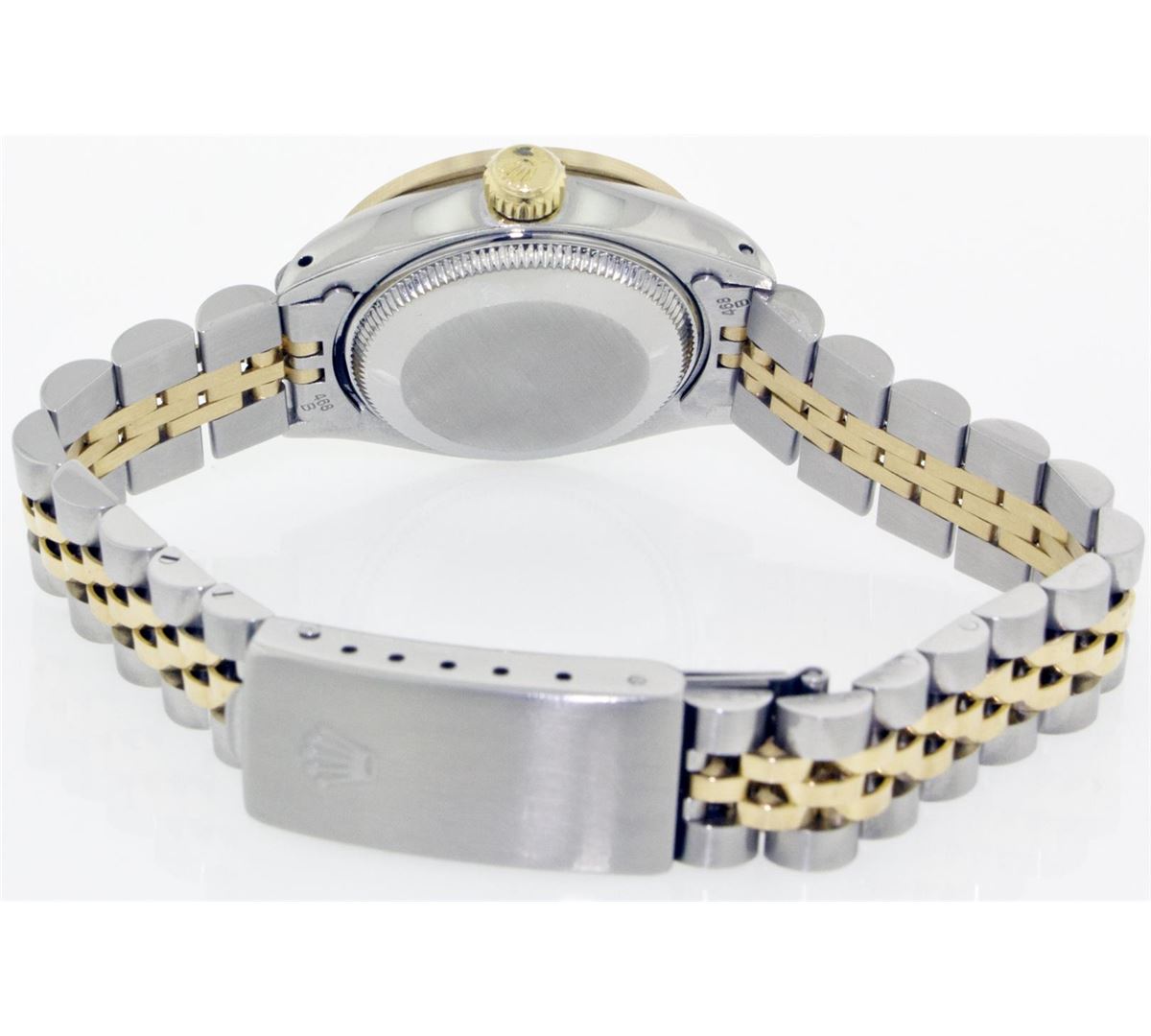 One Ladies Two Tone Rolex Datejust Polished, Serviced & Electronically Tested, 14K Yellow Gold & Stainless Steel Case:26mm, 14K Yellow Gold Crown, Custom Bezel: 18K Yellow Gold Beadset Diamond Bezel, Diamond Count: 32 Diamonds Total Weight .70 Carat, Clarity: Si-VS, Color: G to H. Custom Crystal: Synthetic Sapphire Cyclops Lens. Movement: Automatic Winding Movement Caliber 2030. Custom Dial: Mother Of Pearl String Diamond Dial, Diamond Count: 43 Diamonds, Clarity: SI-VS, Color: G to H. Date Window: 3 O'Clock Position Date Display, Non Quickset, Model: 6917 Condition: G-6 Extra Fine. Bracelet: Two Tone 14K Yellow Gold & Stainless Steel Jubilee. Bright Polish. 5.5 Inch Length, Adjustable. Standard Clasp, With Rolex Logo.