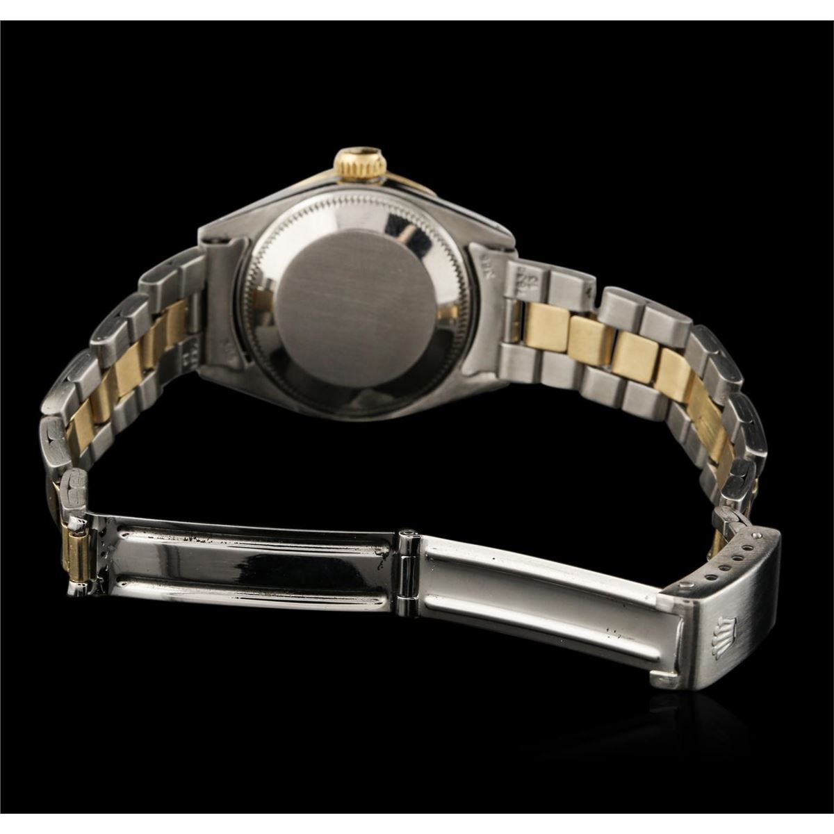 One ladies, hand crafted & machine milled Rolex DateJust Model wristwatch electronically tested, Stainless Steel Case: 26mm oyster, 14KT yellow gold Crown: twinlock with logo, Custom Bezel: diamond set, Custom Crystal: acrylic clops lens. Movement: superlative chronometer. Custom Dial: light mother of pearl, with baton hands, and diamond markers, Date Window: 3 o'clock position date display, non-quick set, Circa: 1973, Condition: G-4 Average. Bracelet: stainless steel and 14KT yellow gold oyster. Bright polish & brushed finish. Six and one half inch length, adjustable. Standard clasp, with logo. Containing: Forty round brilliant cut diamonds, 1.65mm in diameter average, approximate. Total Weight of 40 stones = 0.52ct. Set and graded in the bezel. Clarity: SI-1 to I-1. Color: F - H. Total Weight of Diamonds 0.52ct. Total Weight of Watch 46.07 grams. AIG Appraised at $8,050.00.