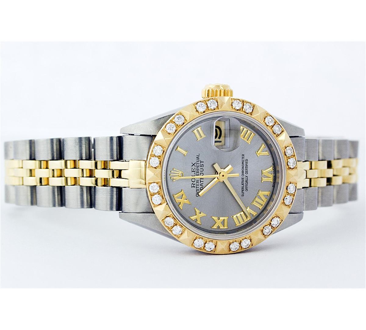 One Ladies Two Tone Rolex Datejust Polished, Serviced & Electronically Tested, 14K Yellow Gold & Stainless Steel Case:26mm, 14K Yellow Gold Crown, Custom Bezel: 18K Yellow Gold Pyramid Diamond Bezel, Diamond Count: 24 Diamonds Total Weight .50 Carat, Clarity: Si-VS, Color: G to H. Custom Crystal: Synthetic Sapphire Cyclops Lens. Movement: Automatic Winding Movement Caliber 2030. Custom Dial: Slate Grey With Roman Hour Markers. Date Window: 3 O'Clock Position Date Display, Non Quickset, Model: 6917 Condition: G-6 Extra Fine. Bracelet: Two Tone 14K Yellow Gold & Stainless Steel Jubilee. Bright Polish. 5.5 Inch Length, Adjustable. Standard Clasp, With Rolex Logo.